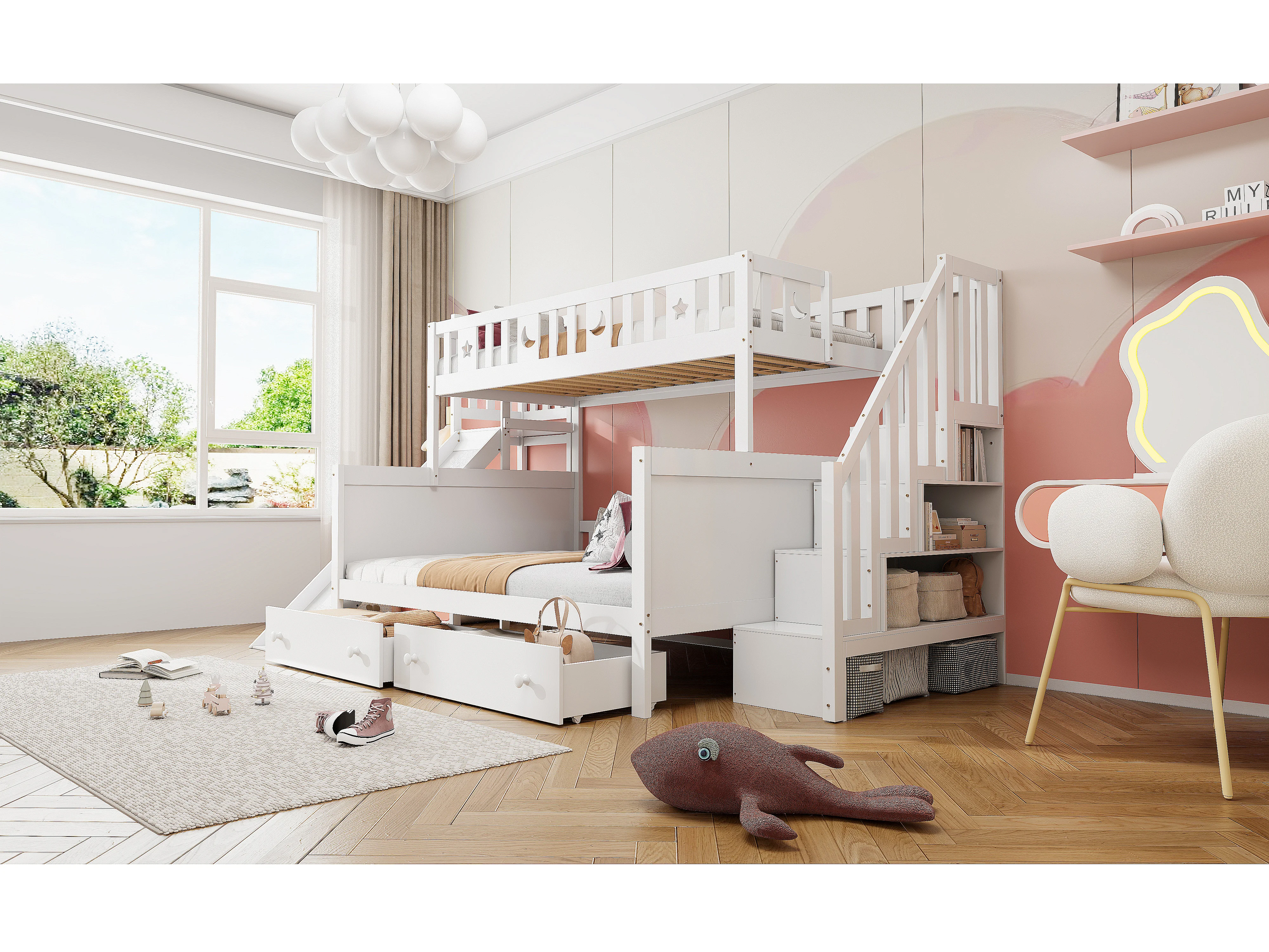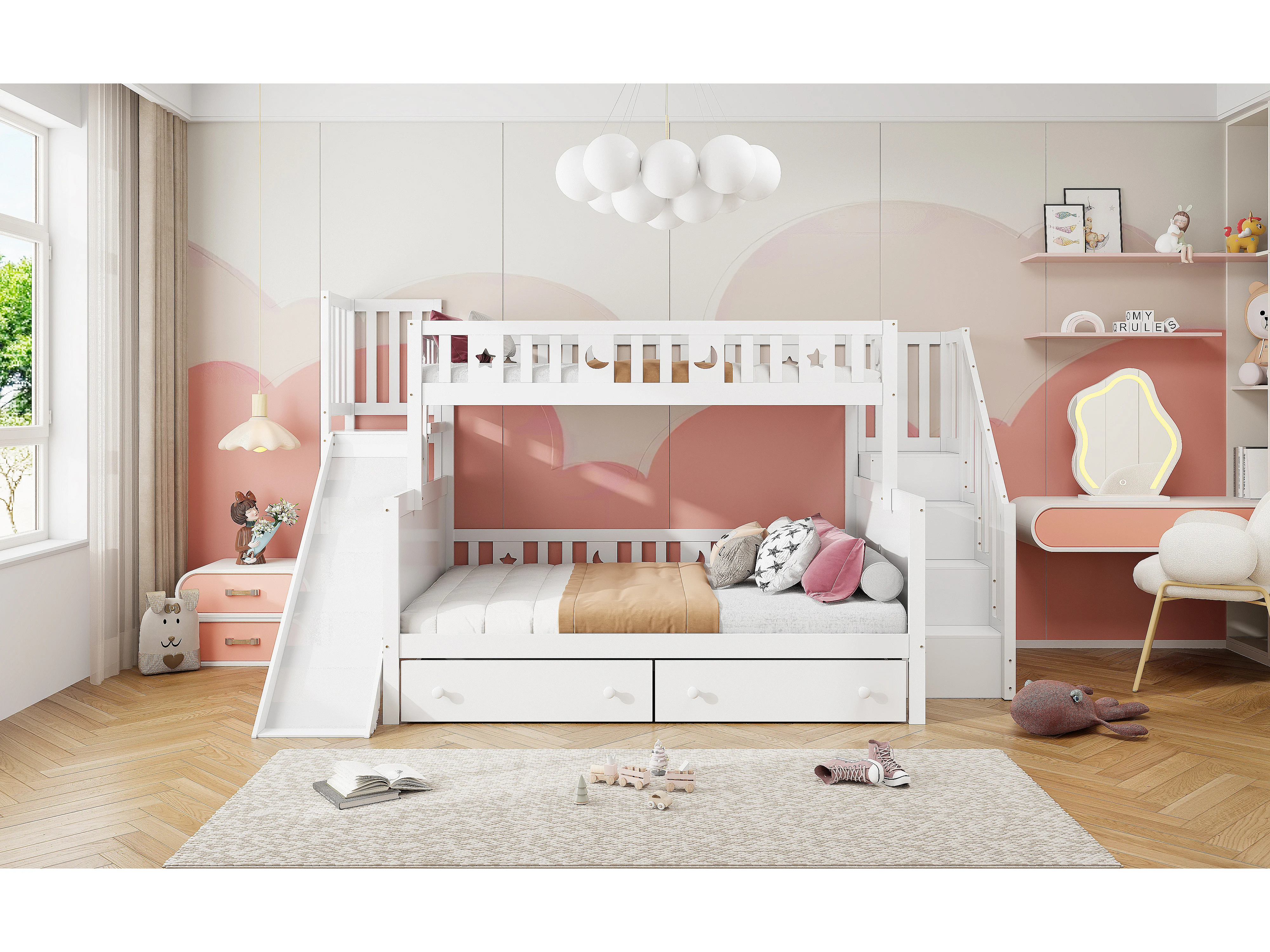 Lit superposés enfant90 x 200 cm + 140 x 200 cm - avec toboggan + escalier de rangement + 2 tiroirs - bois - blanc