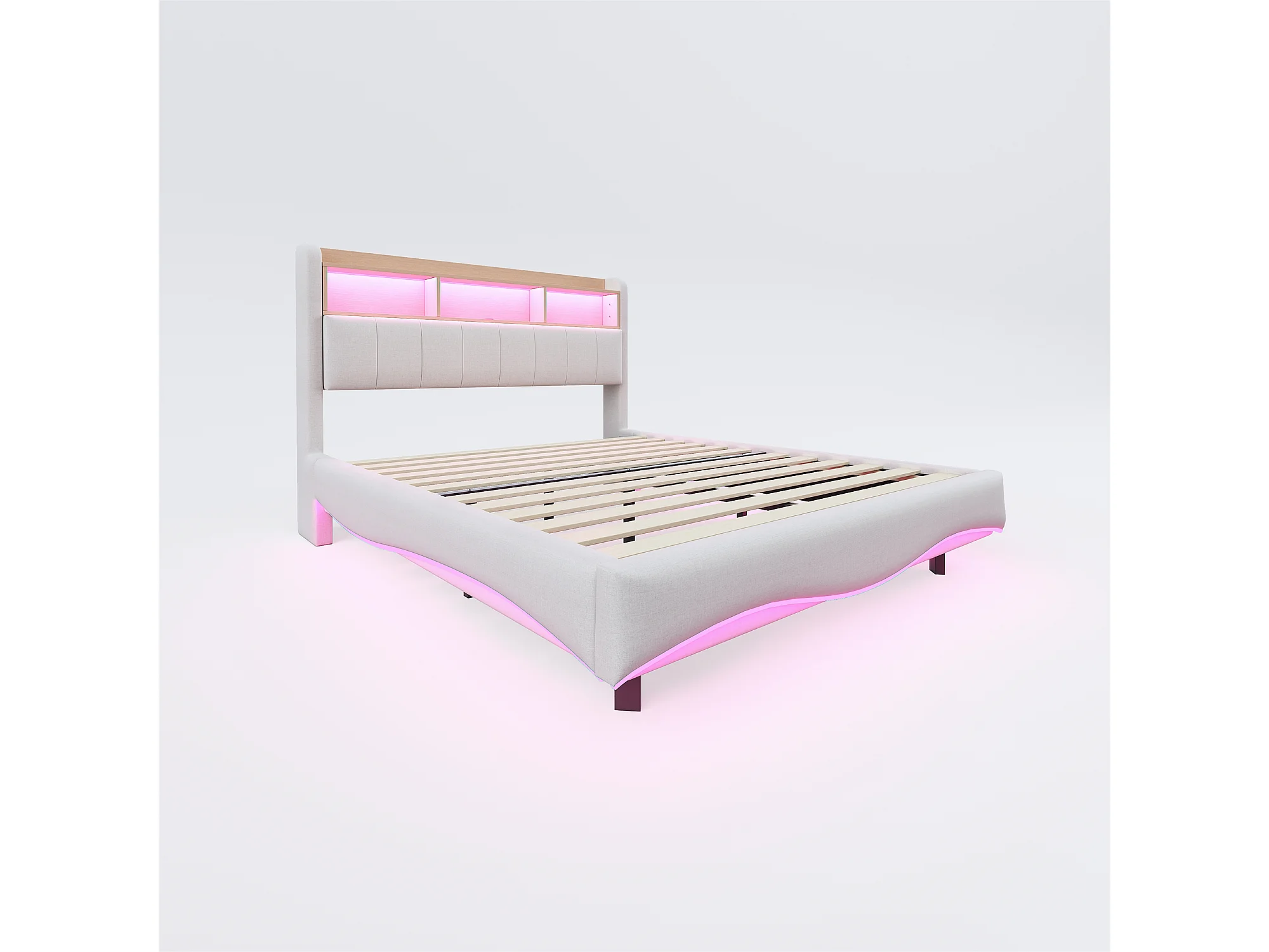 Lit suspendu en lin 160×200 cm, avec éclairage LED, ports USB et Type-C, beige, design moderne et fonctionnel