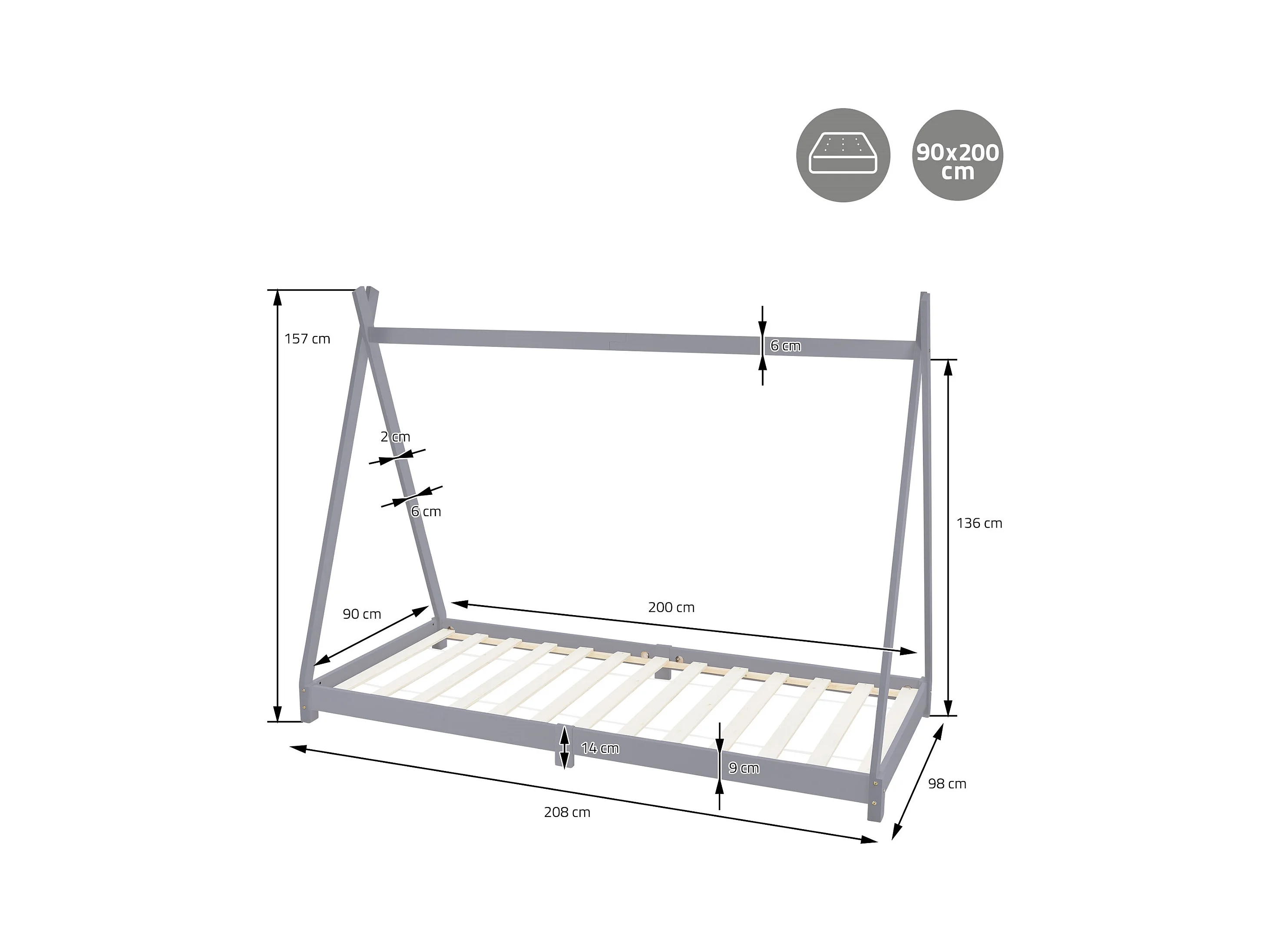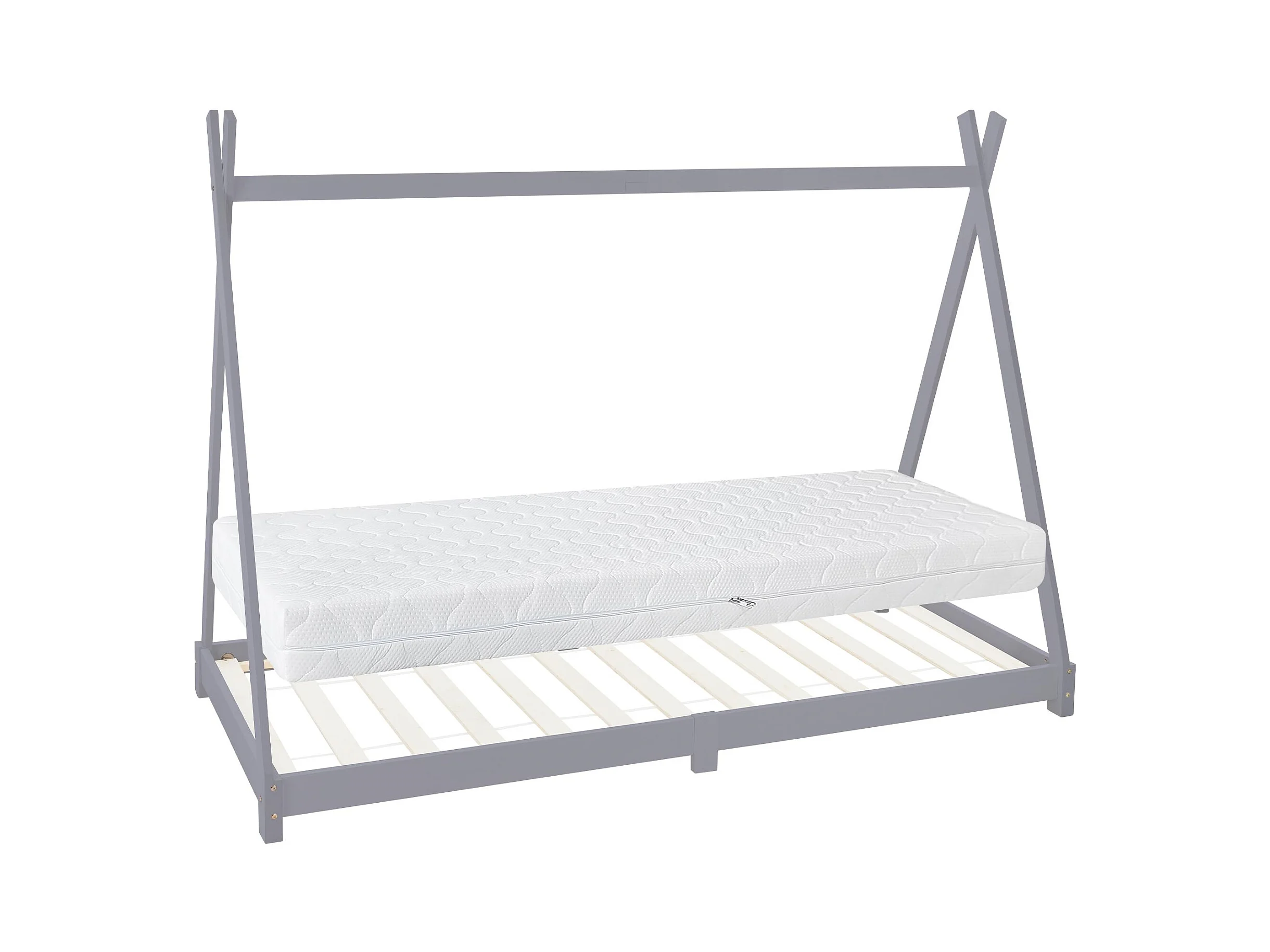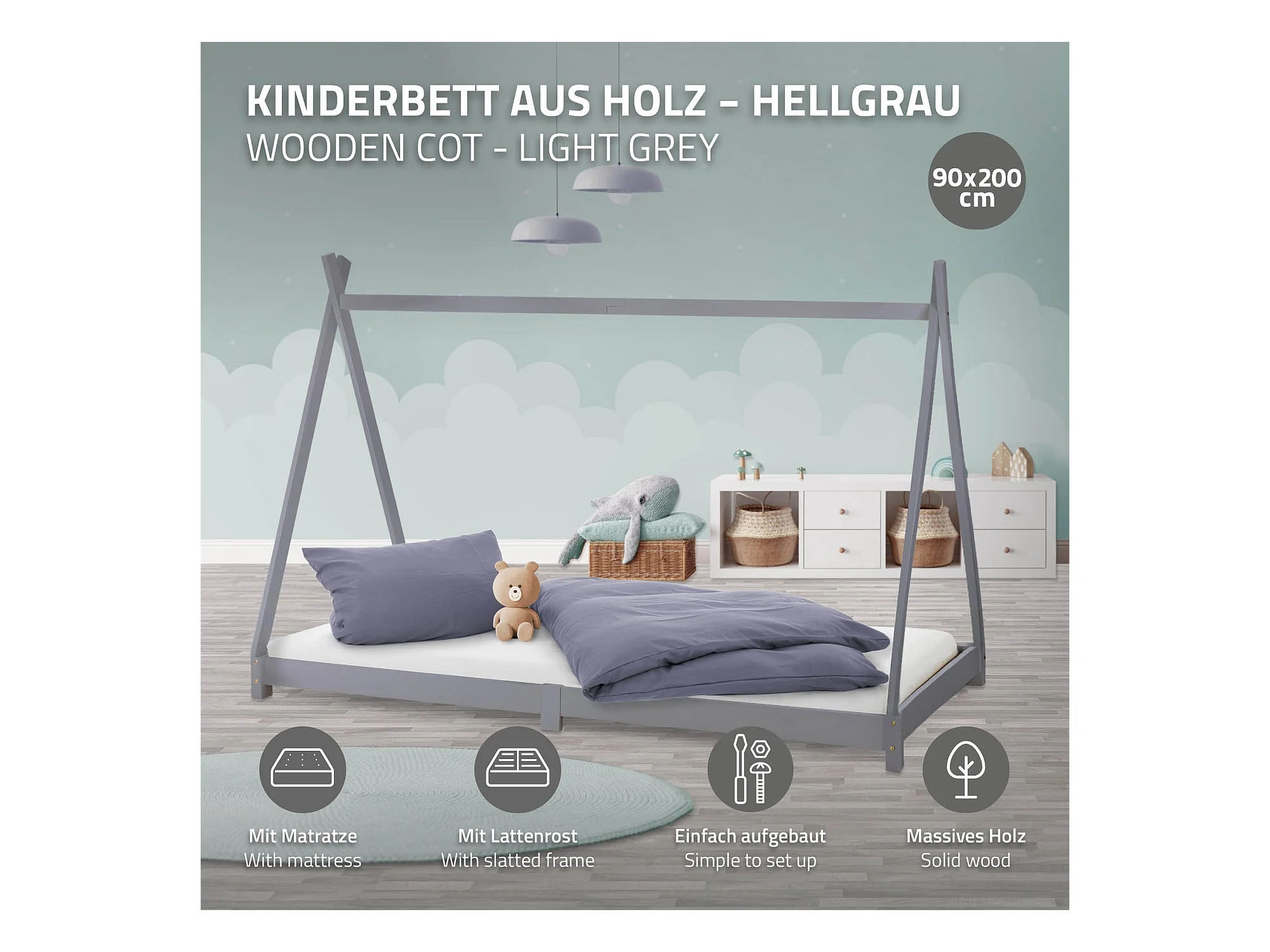 Lit d'enfant Tipi 90x200 cm gris clair style indien bois de pin massif avec matelas H:16cm housse amovible sommier à lattes d'intérieur filles garçons