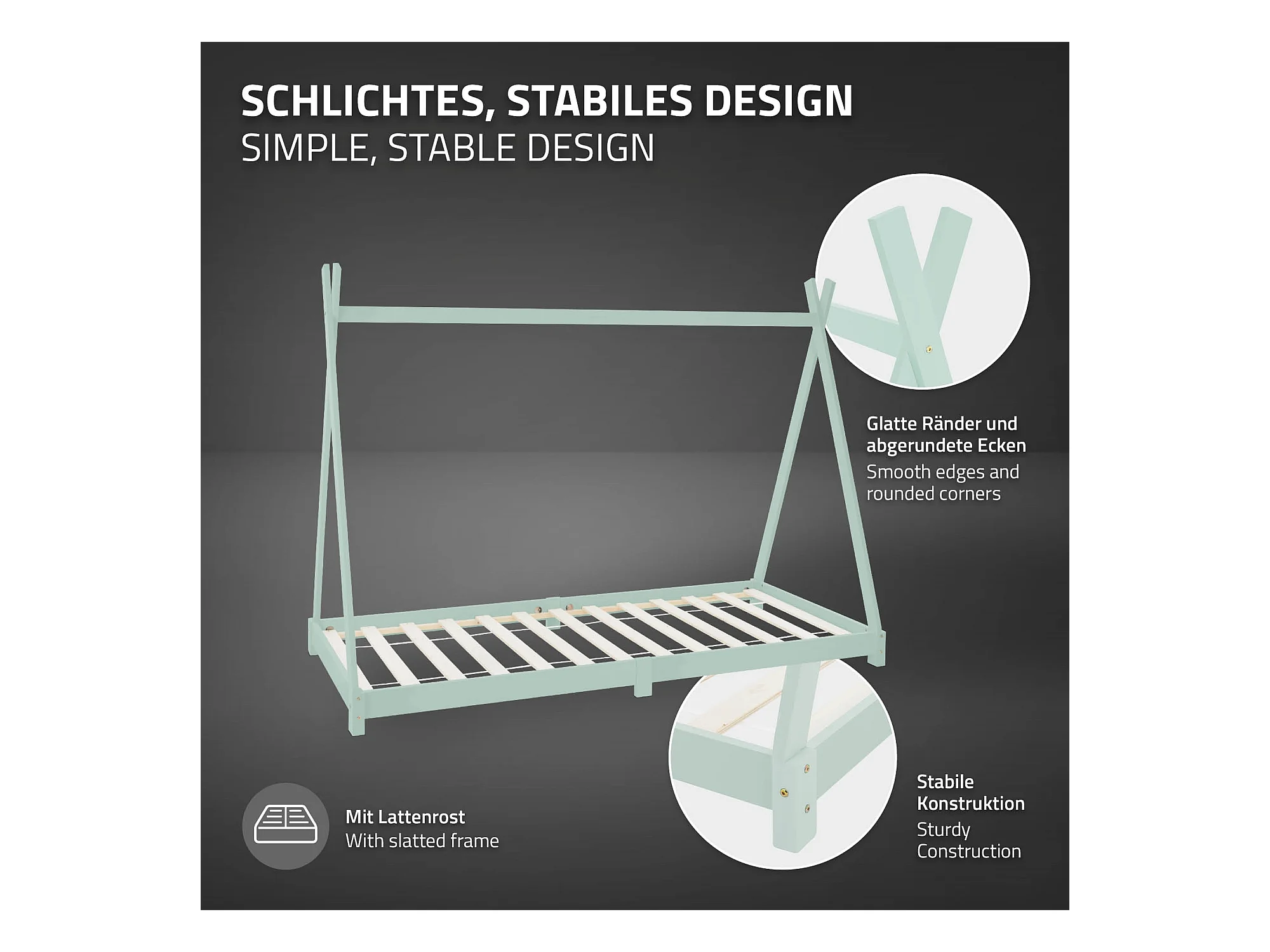 Lit d'enfant Tipi 90x200cm vert menthe style indien bois de pin massif avec matelas H:16cm housse amovible sommier à lattes d'intérieur filles garçons