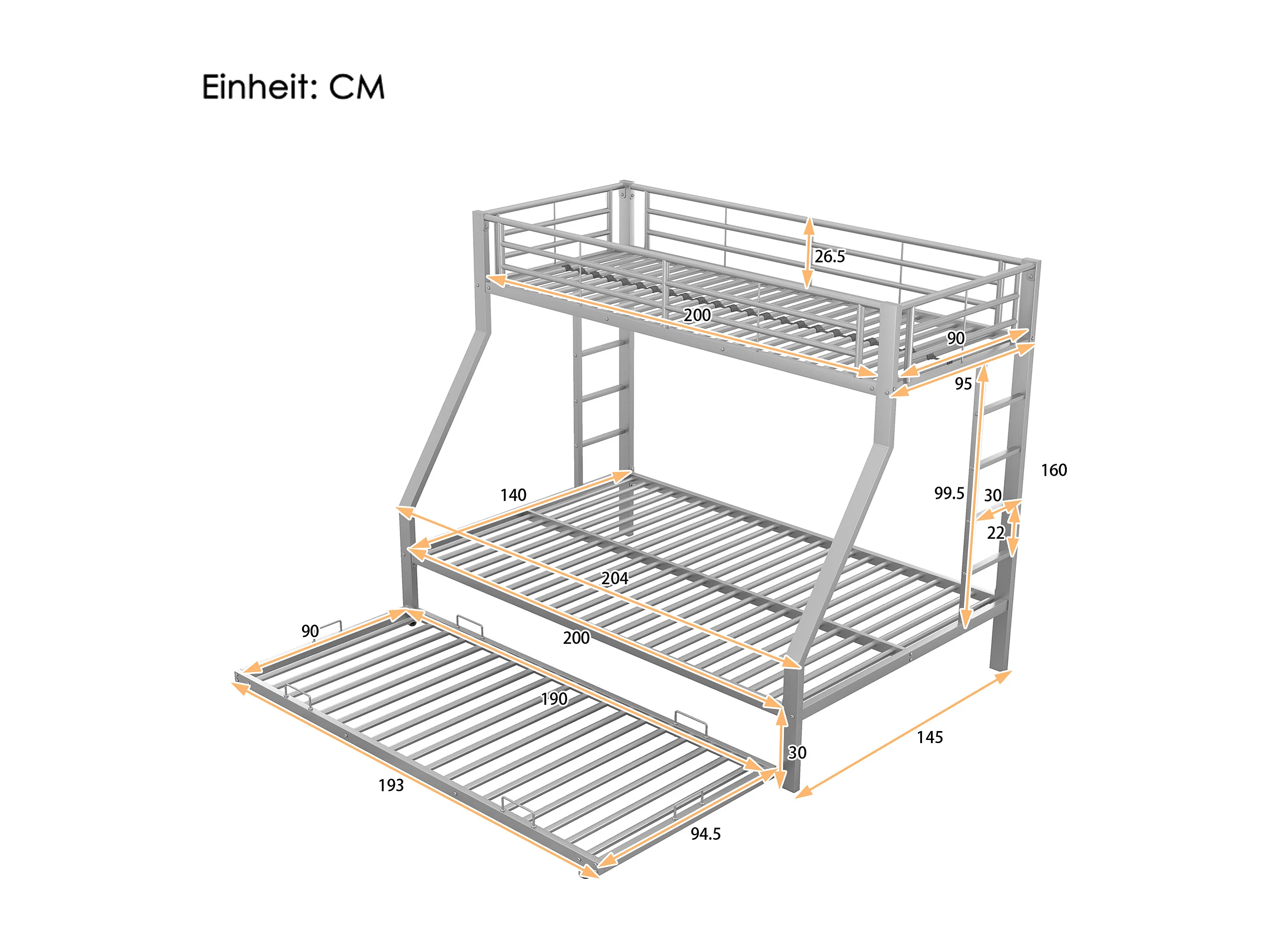 Lits superposé enfant 90x200cm + 140x200cm avec 1 lit gigogne 90x190cm, Argent, sans matelas