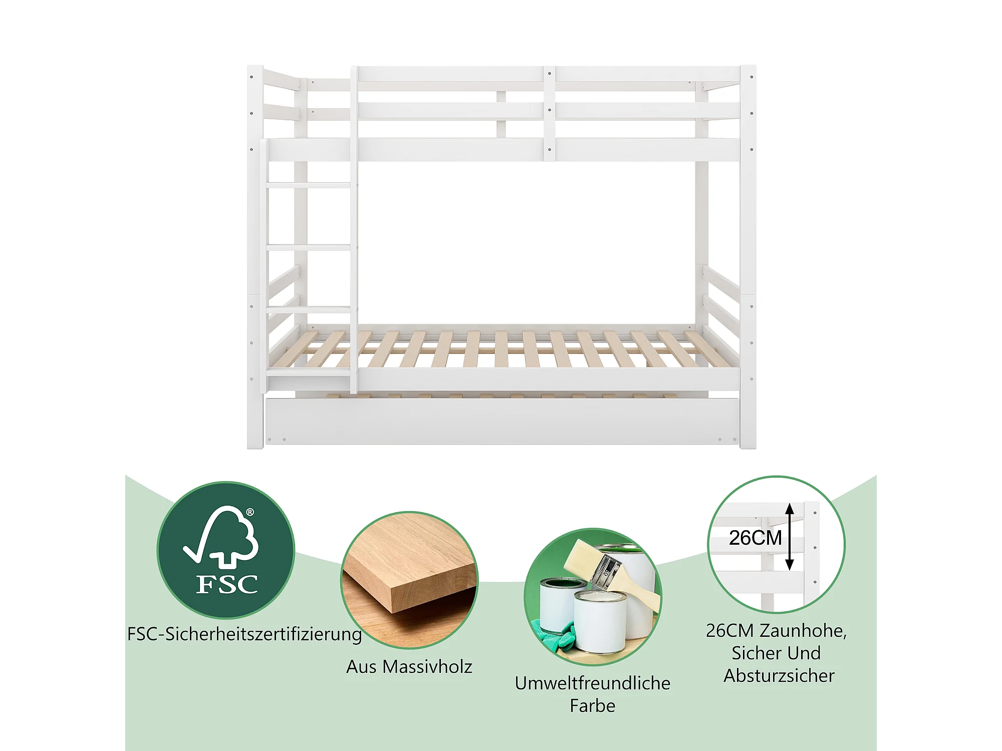 Lits superposés 2 x 140 x 200 cm avec lit gigogne 90 x 200 cm - garde-corps et escalier - Bois MDF - blanc