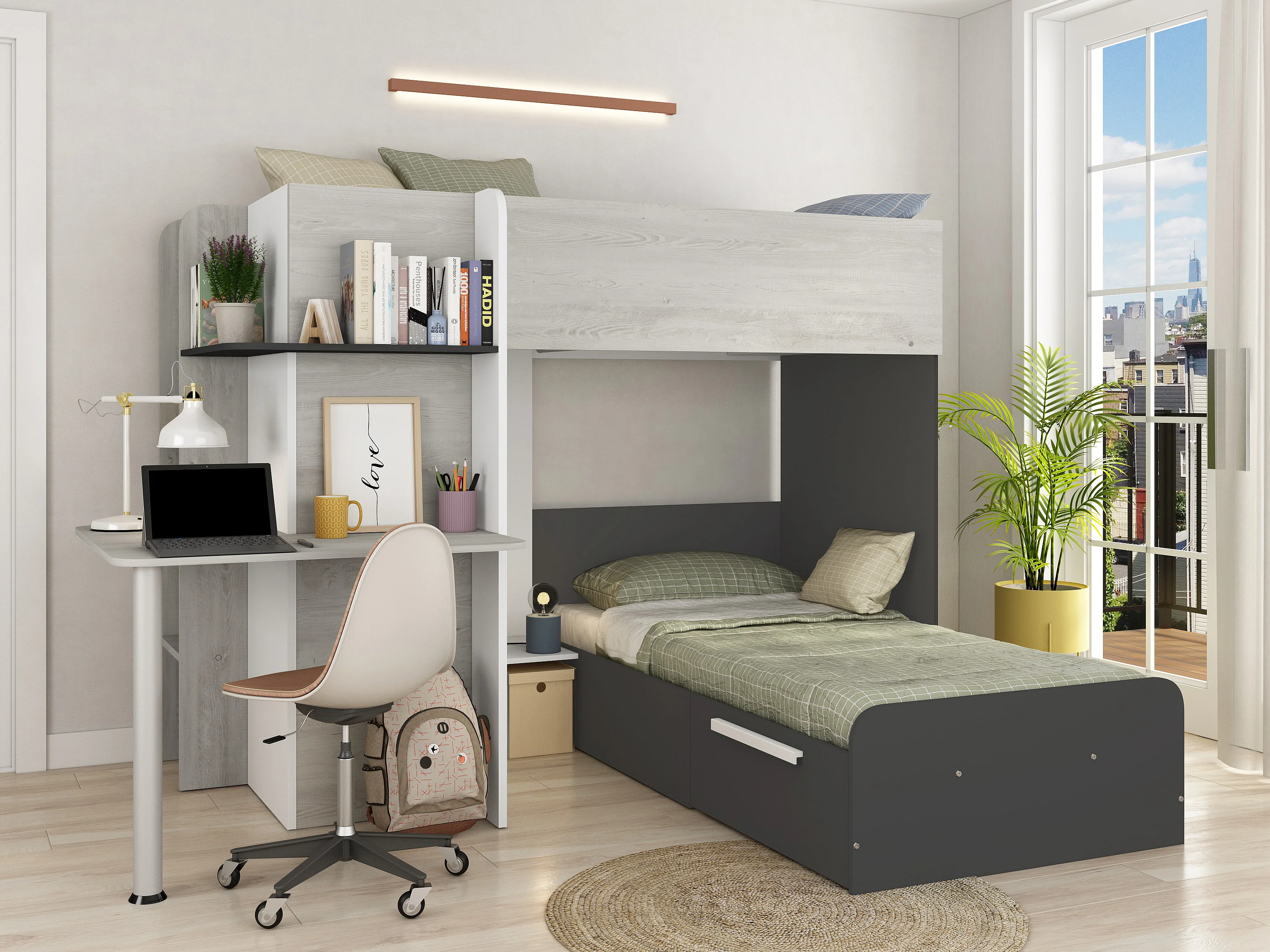 Lits superposés d'angle 2 x 90 x 190 cm - Avec bureau - Gris, blanc et noir + Matelas - SAMUEL