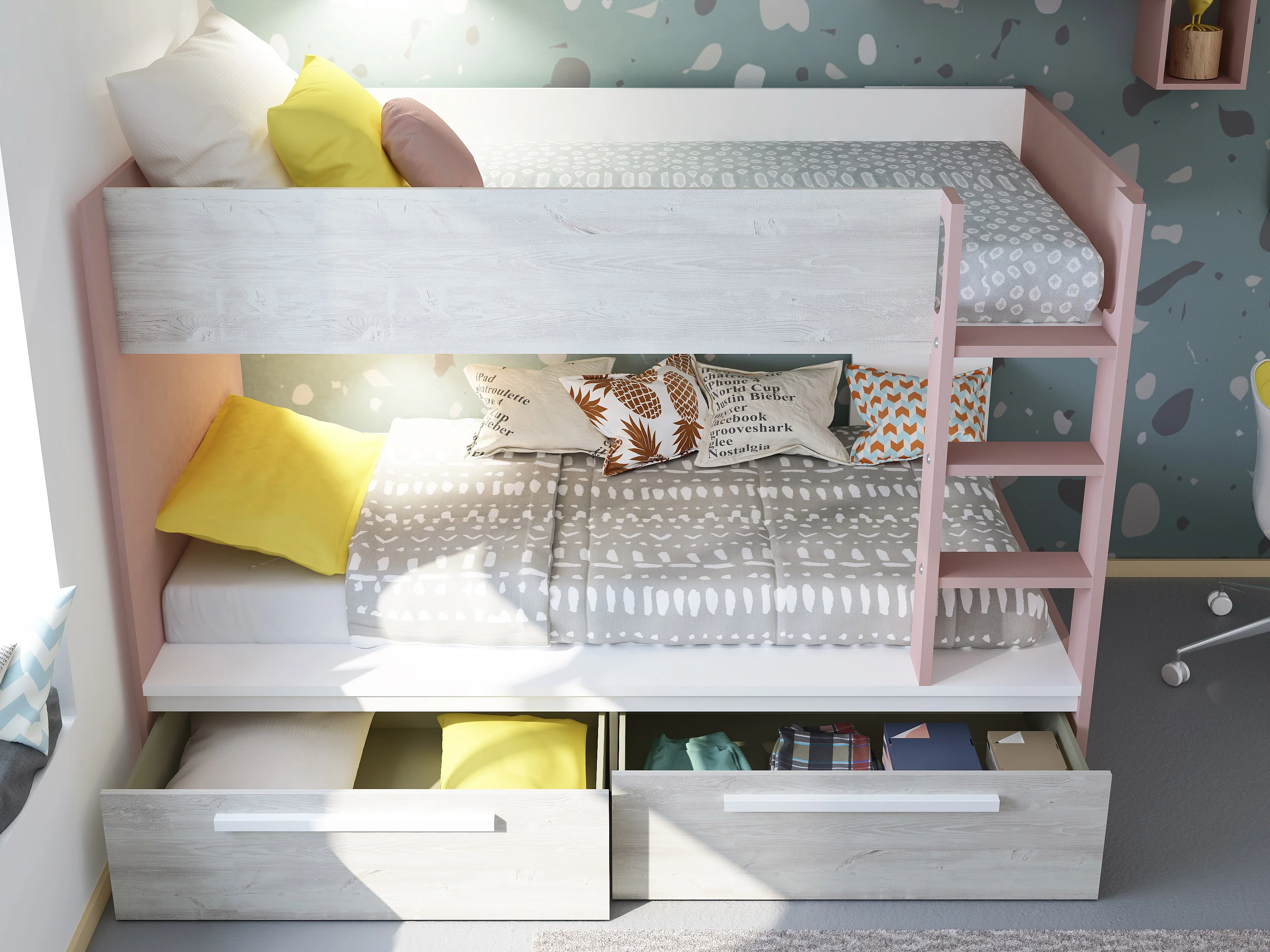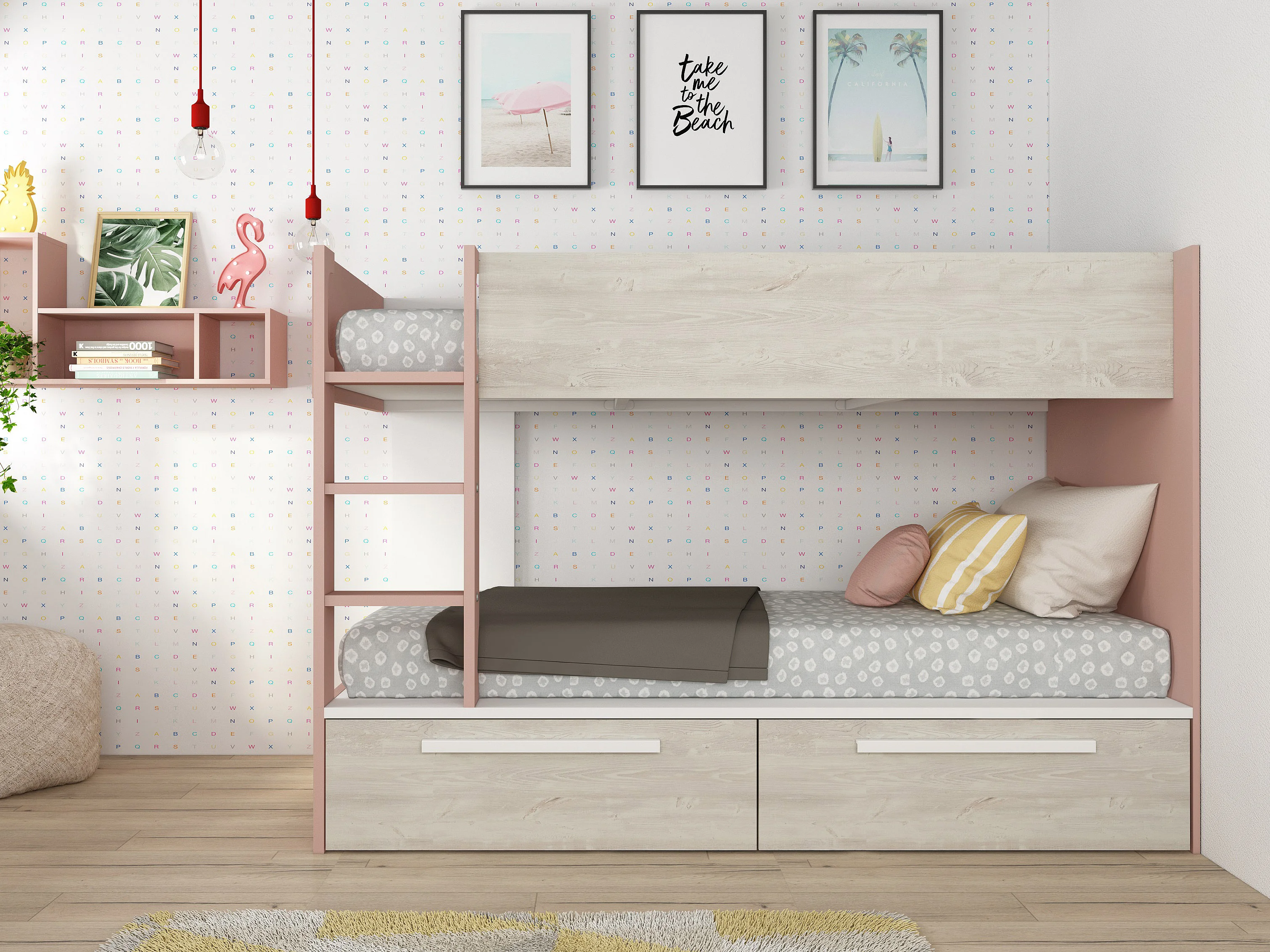 Lits superposés 2 x 90 x 200 cm - 2 tiroirs - Rose, naturel et blanc - TINOLI