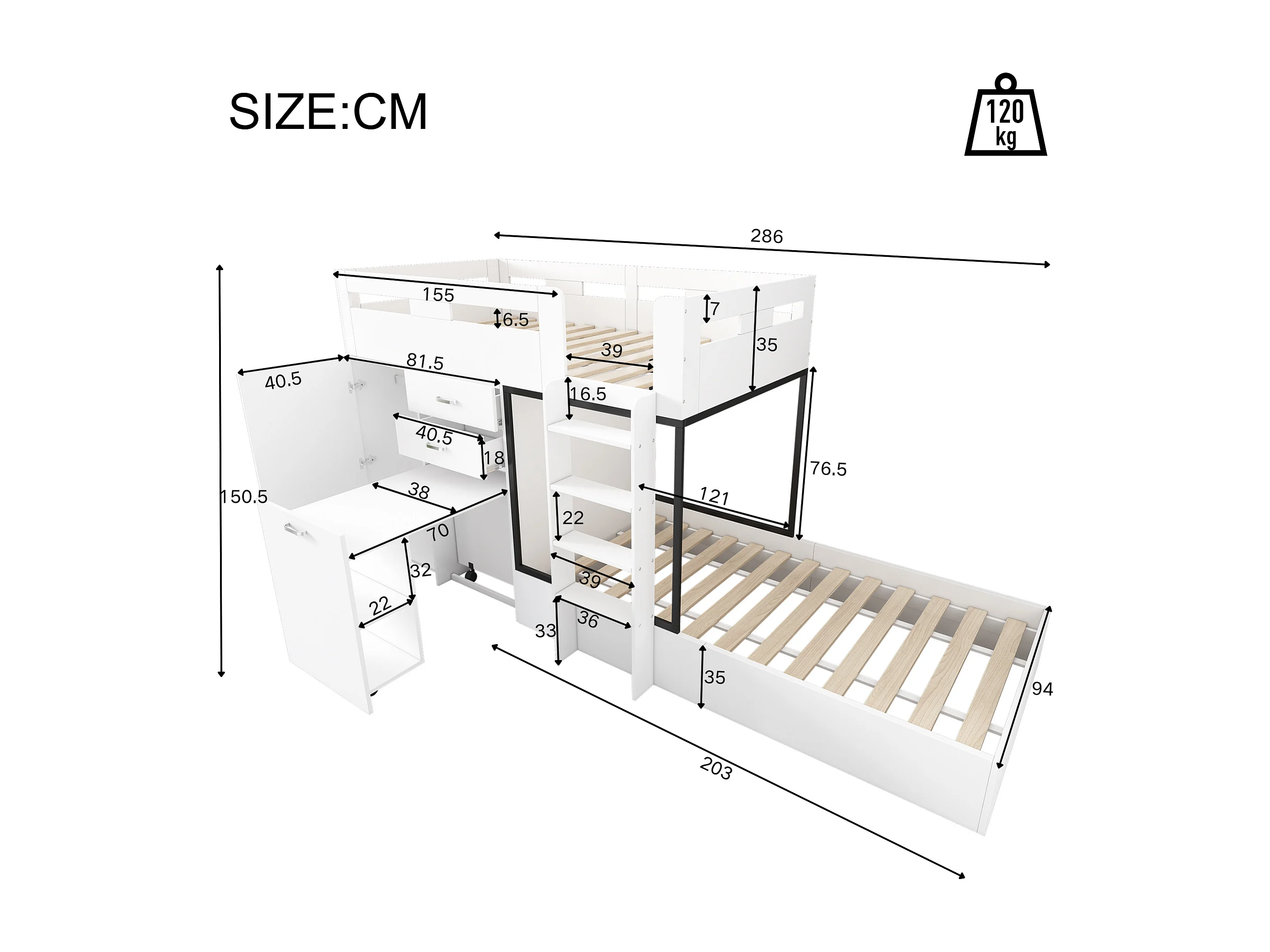 Lits superposés 2 x 90 x 200 cm avec armoire + bureau et 2 tiroirs - MDF - sommier à lattes - blanc