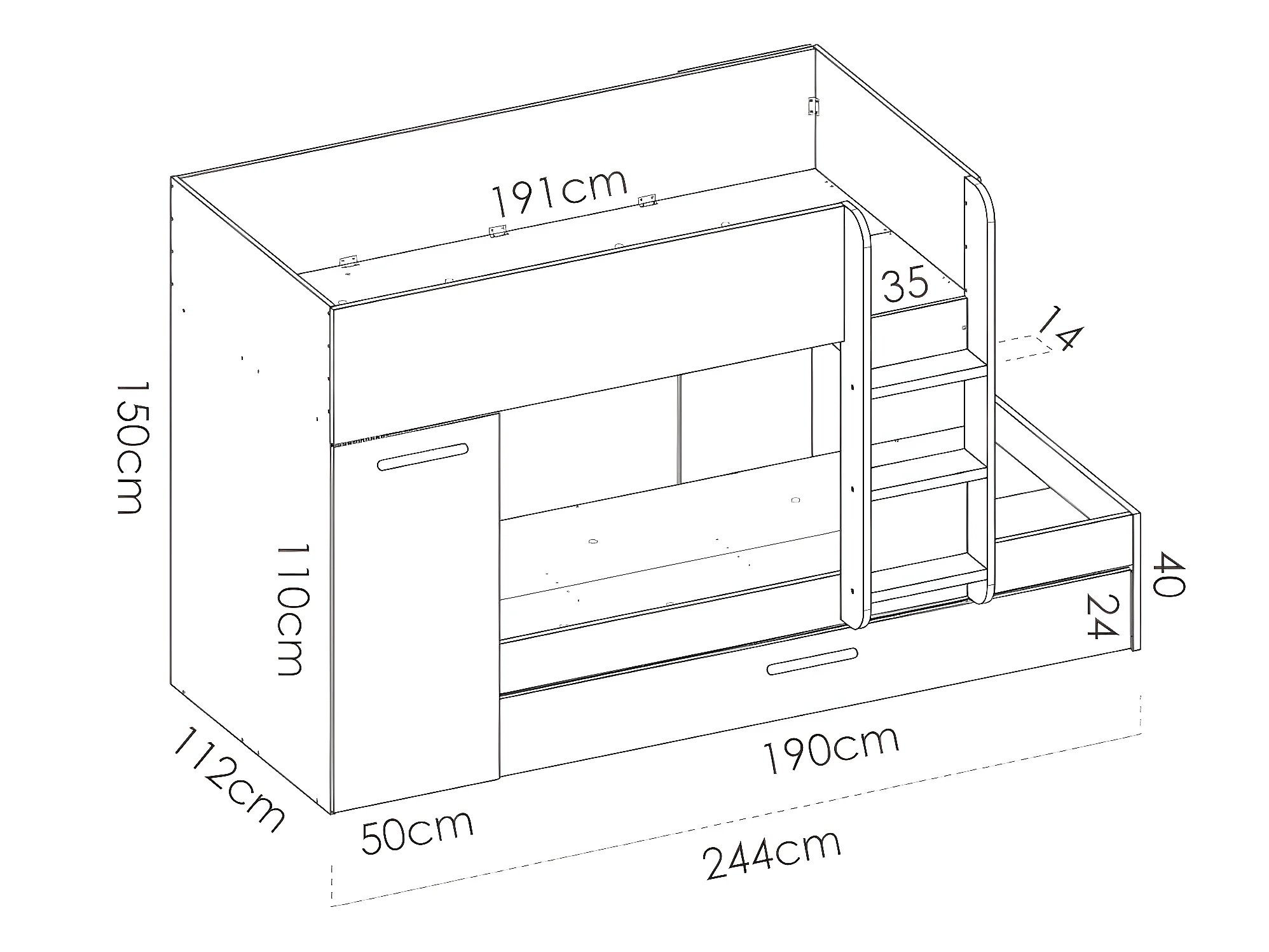 Lits superposés avec tiroir lit gigogne et rangements 3 x 90 x 190 cm - Blanc et Naturel - ANTHONY