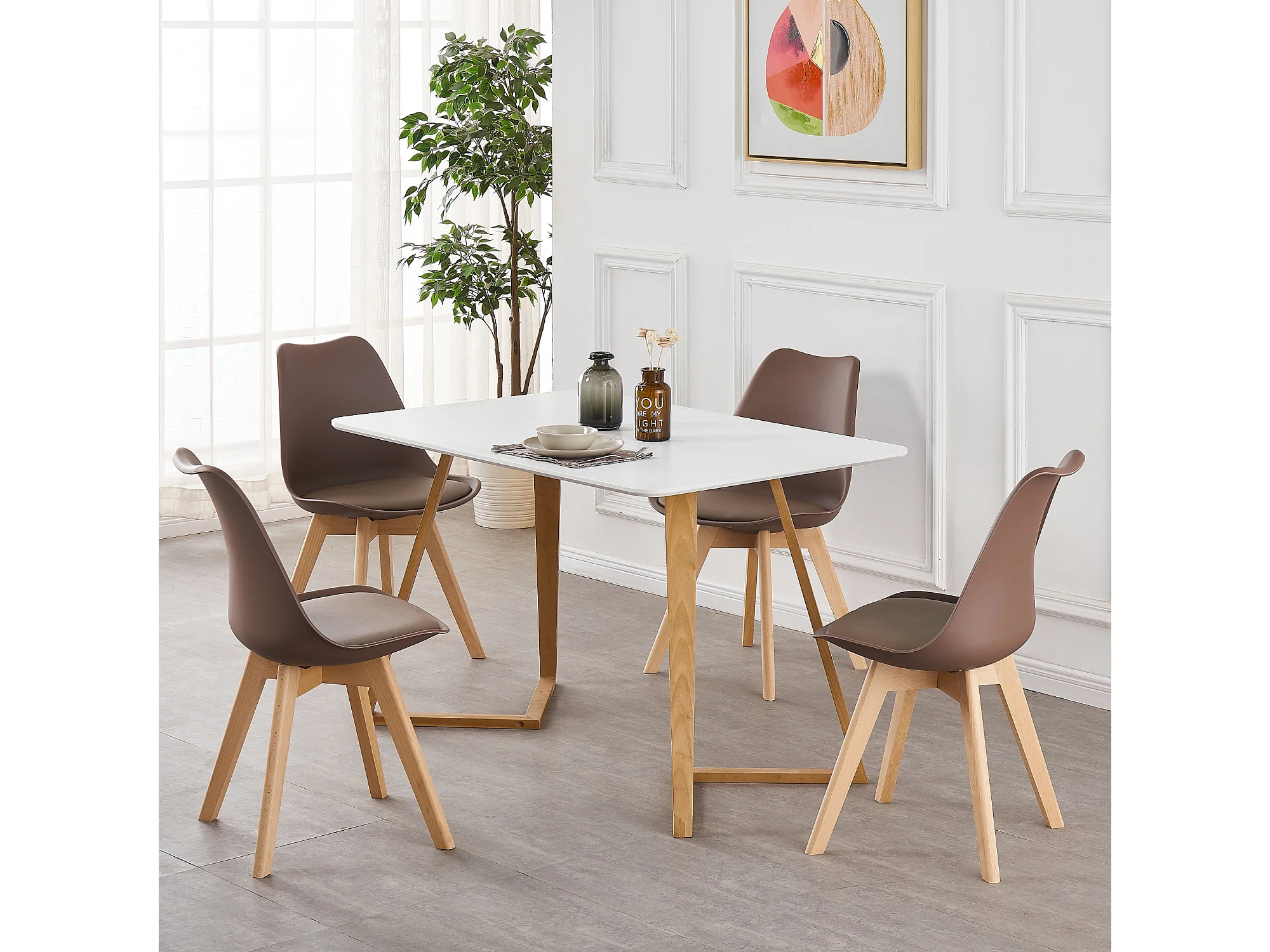 Ensemble de 4 chaises de salle à manger Lorenzo avec siège en similicuir élégant et pieds en bois massif - Parfait pour la salle à manger, le salon - Marron