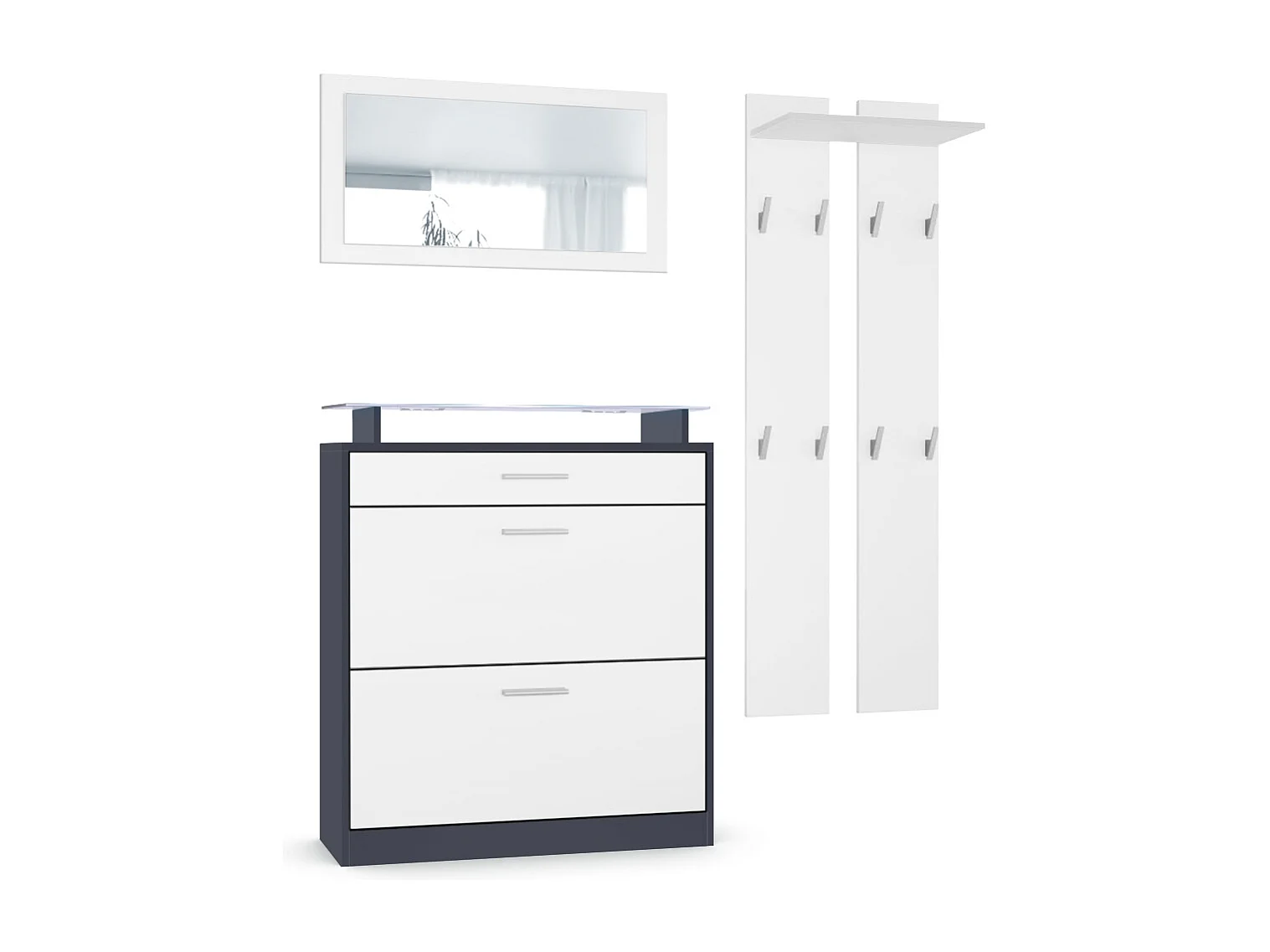 Loret Ensemble penderie, meuble à chaussures 89 x 104 x 23 cm avec miroir, 2 panneaux murales et éclairage LED Blanc, Anthracite mat & Blanc mat