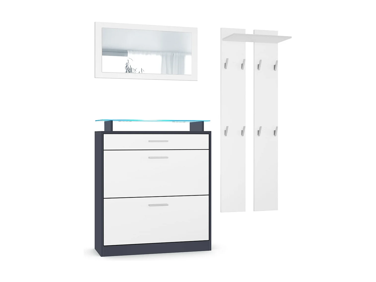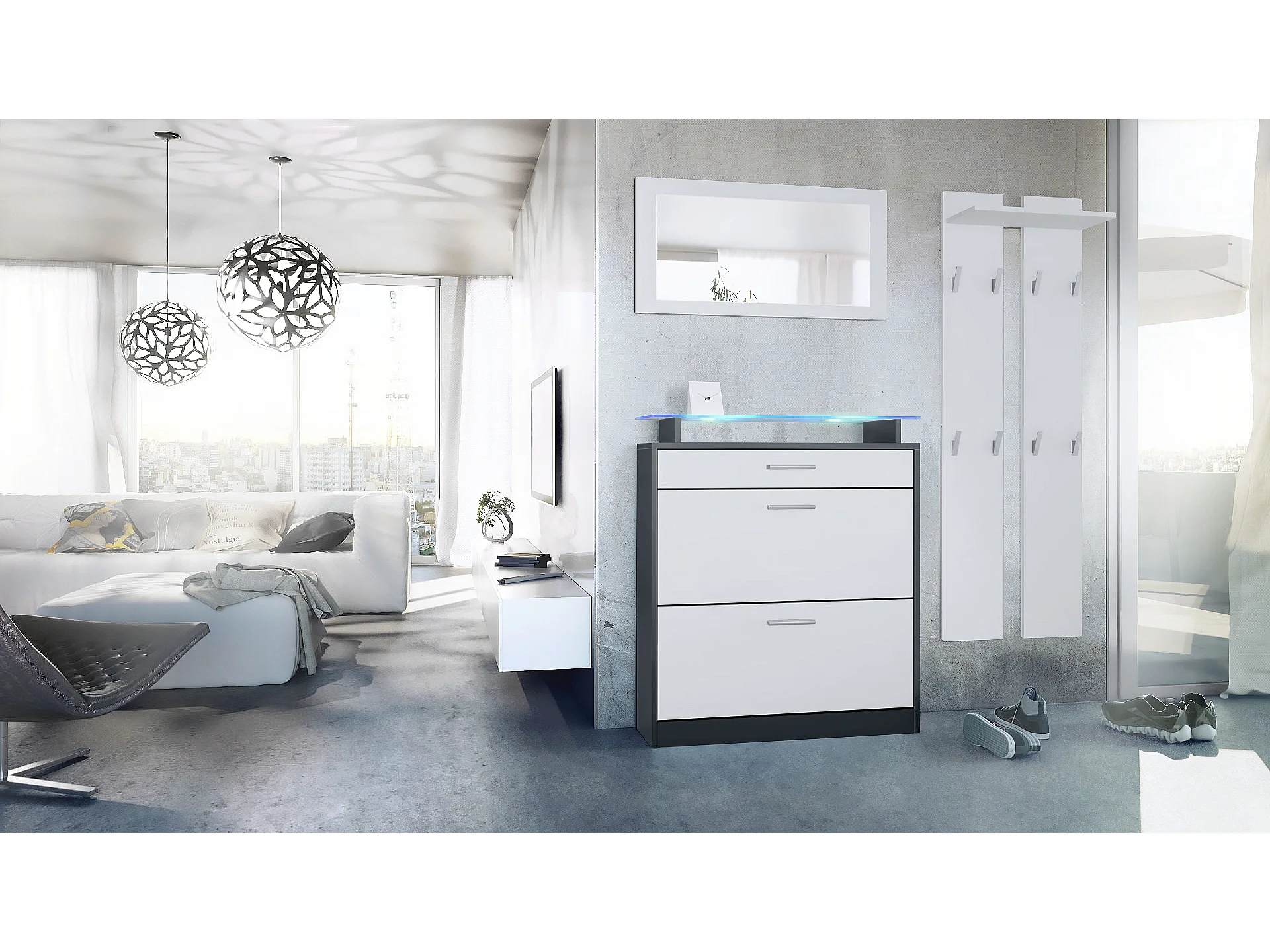 Loret Ensemble penderie, meuble à chaussures 89 x 104 x 23 cm avec miroir, 2 panneaux murales et éclairage LED Bleu, Anthracite mat & Blanc mat
