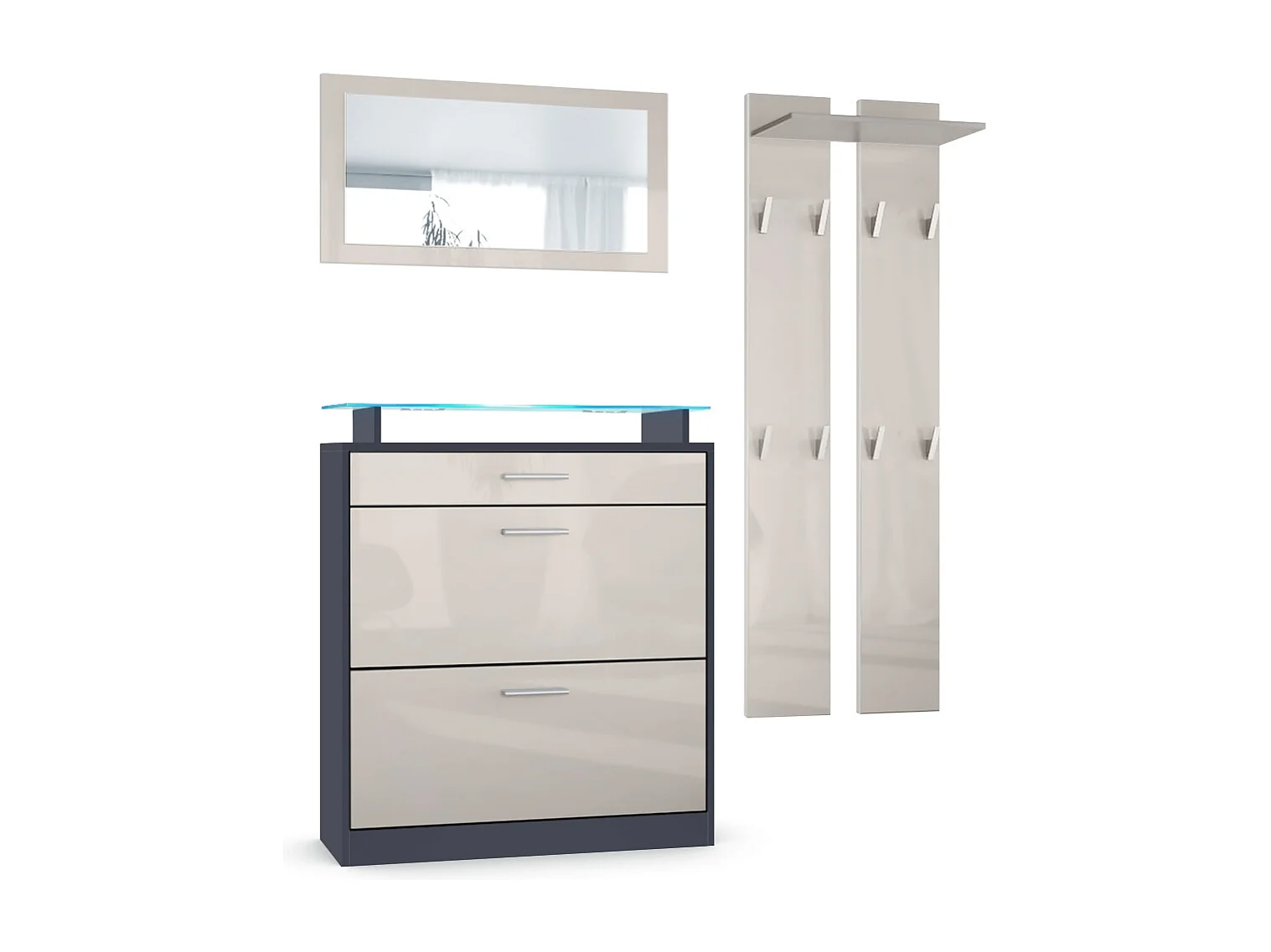 Loret Ensemble penderie, meuble à chaussures 89 x 104 x 23 cm avec miroir, 2 panneaux murales et éclairage LED Bleu, Anthracite mat & Gris sable brillant