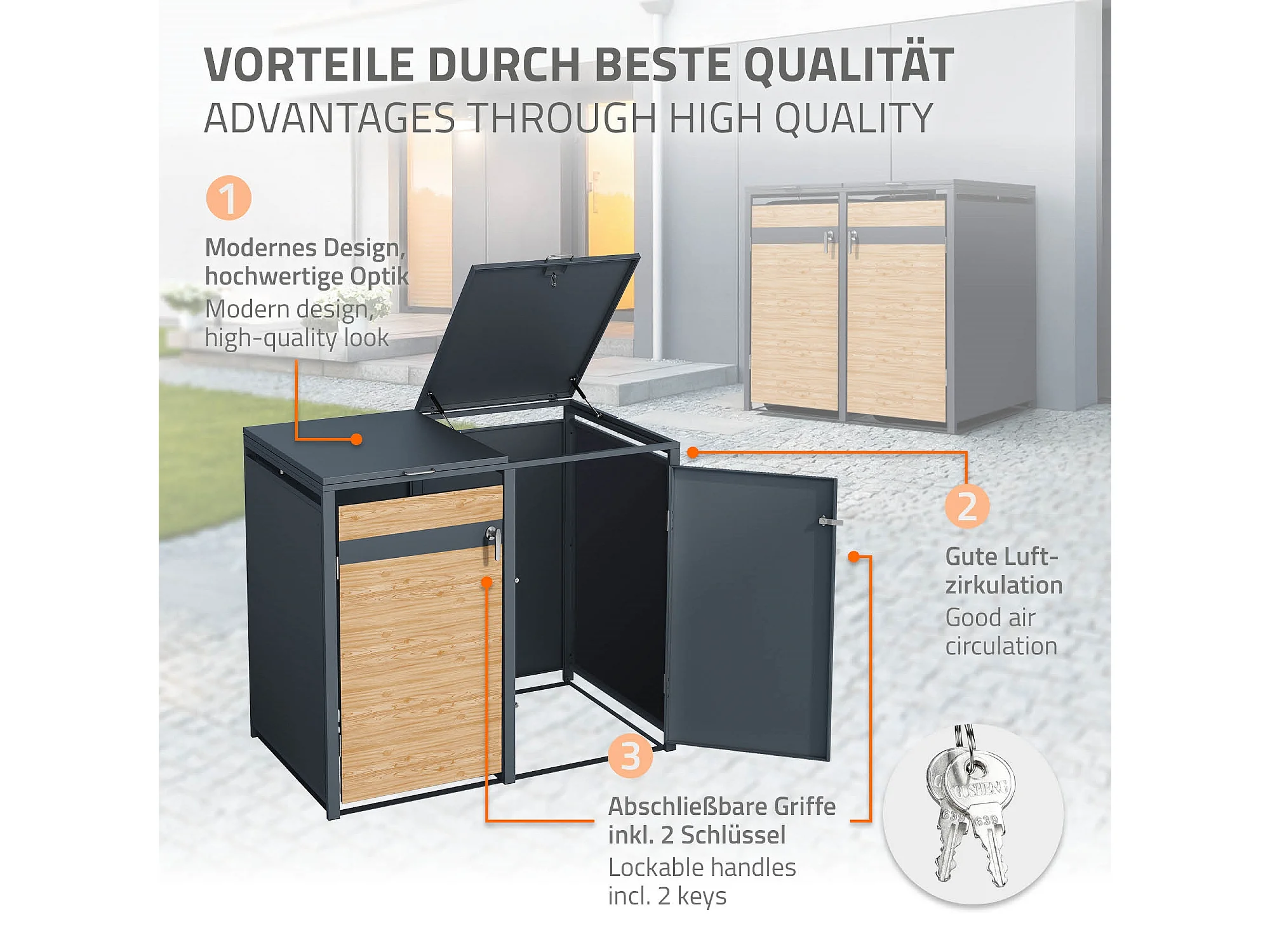 Abri pour 4 poubelles 264x80x116,3 cm capacité de 60L à 240L anthracite/aspect mélèze acier couvercle rabattable/4 portes résistant aux intempéries