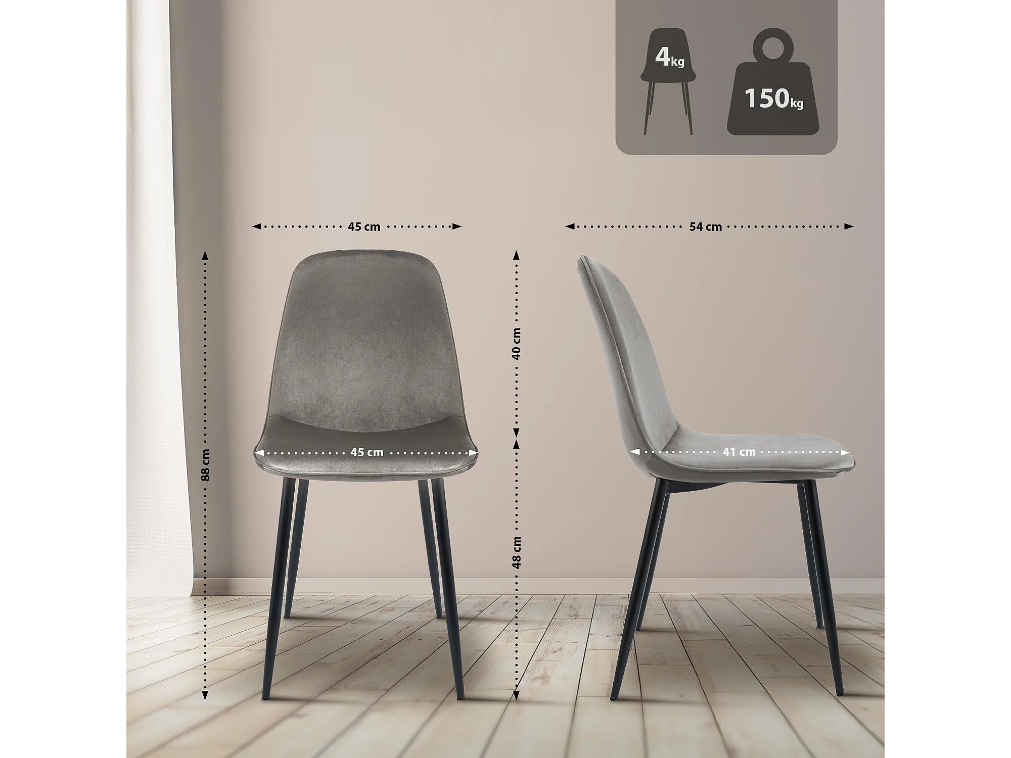 Sari | Chaise en velours gris / Noir, paquet de 2
