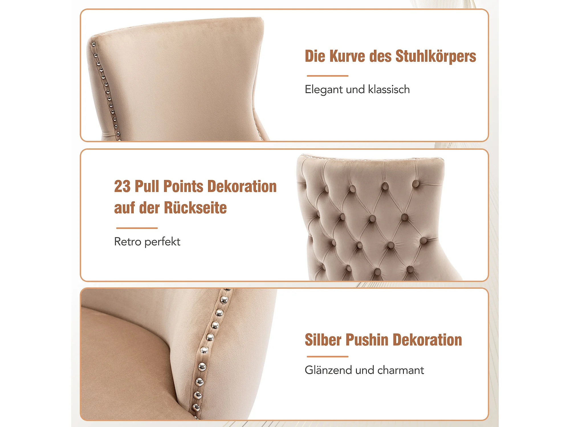 Lot de 2 chaises de salle à manger, velours beige, avec coutures boutonnées, structure en bois massif