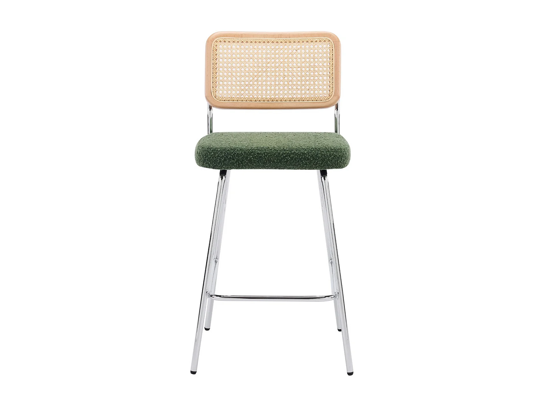 Lot de 2 chaises de bar en cannage et tissu bouclé vert, piètement chromé - Muse