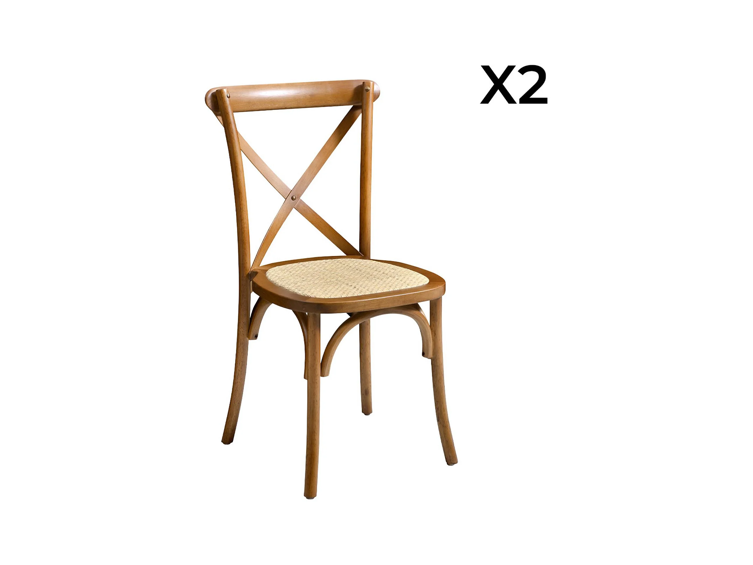 Lot de 2 chaises de bistrot en bois d'hévéa effet noyer. vintage. assise en rotin. empilables