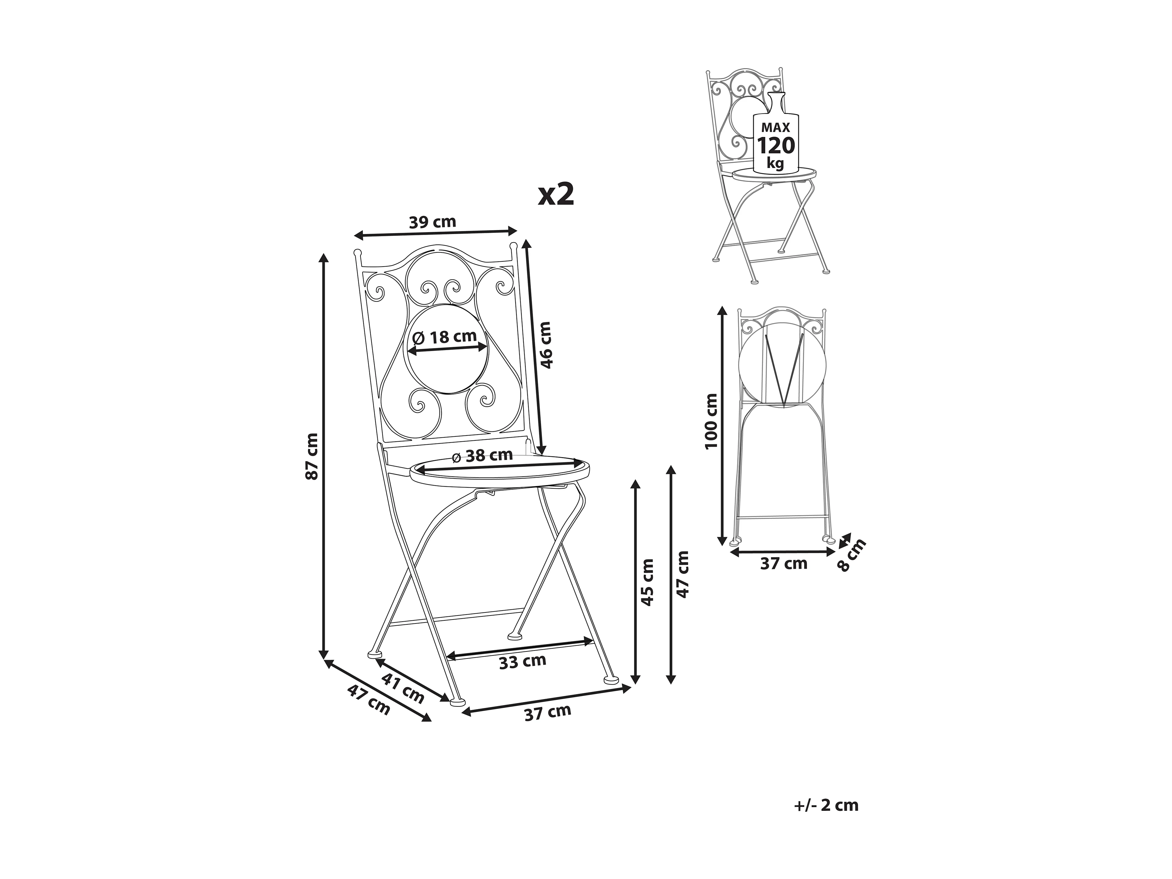 Pack de 2 chaises de jardin pliantes Perla en métal noir
