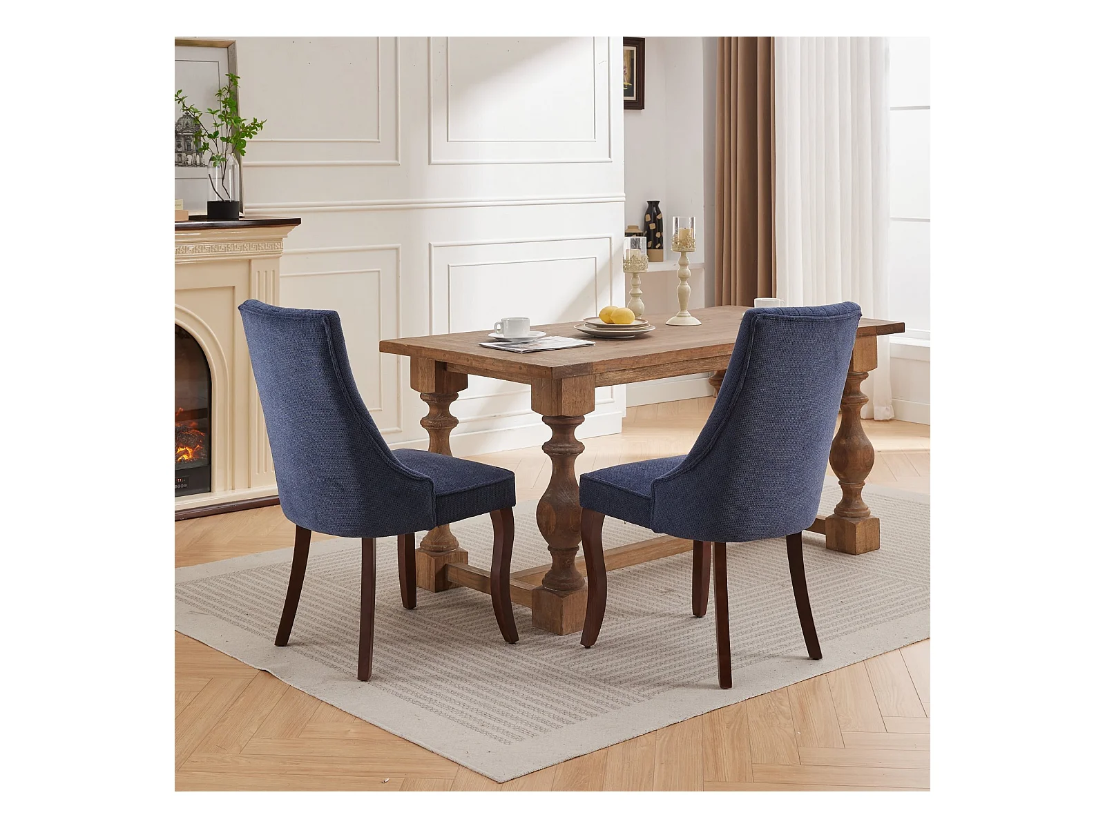 Lot de 2 chaises de salle à manger - Chaises avec pieds courbés en bois massif et dossiers rembourrés - chenille bleu