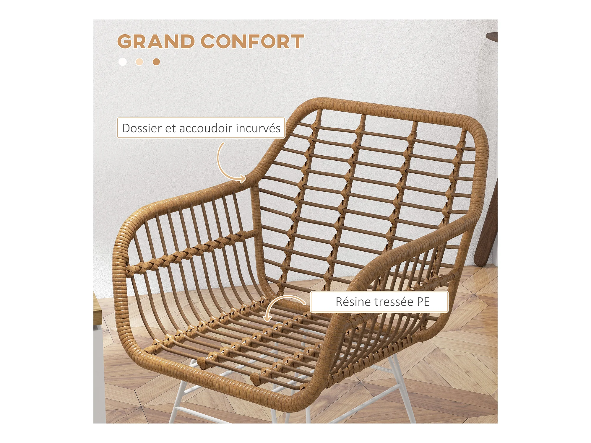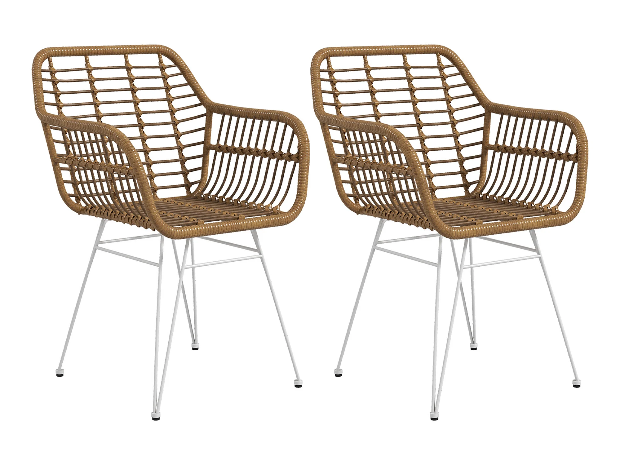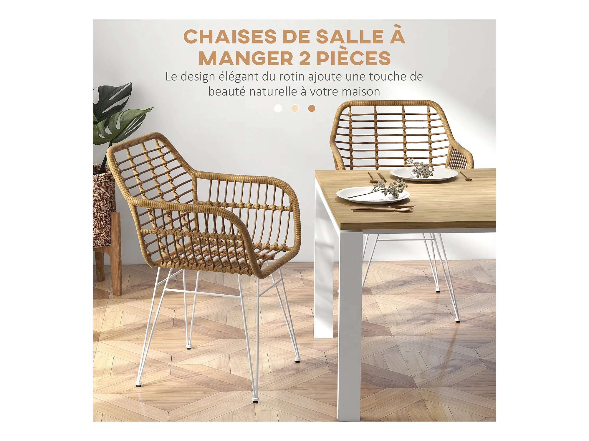 Lot de 2 chaises de salon style bohème piètement épingle acier blanc revêtement résine tressée marron clair