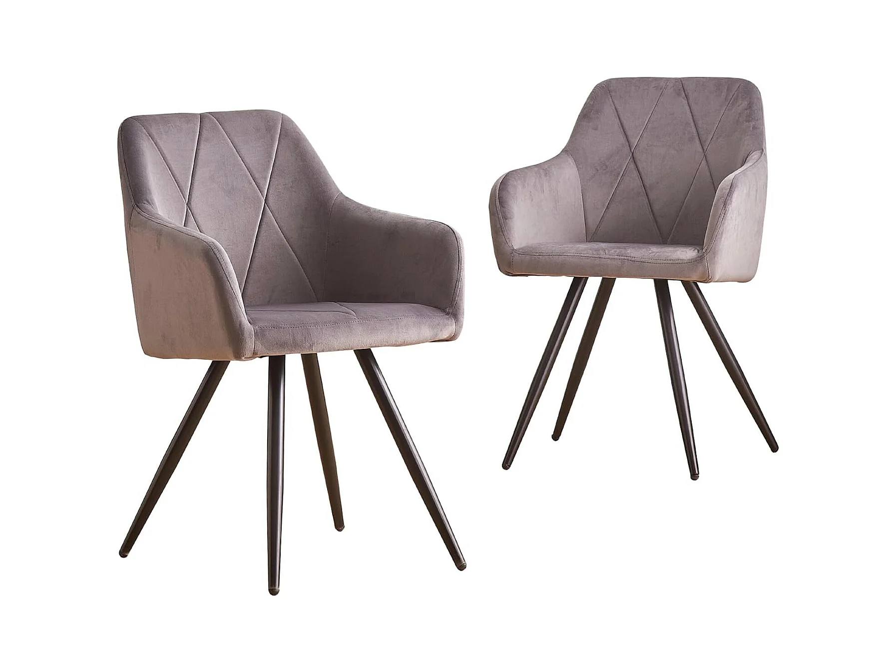 Lot de 2 chaises en velours gris, dossier rembourré, pieds en métal argenté - pour salle à manger et salon