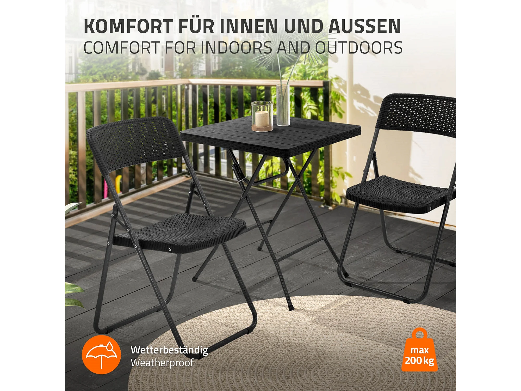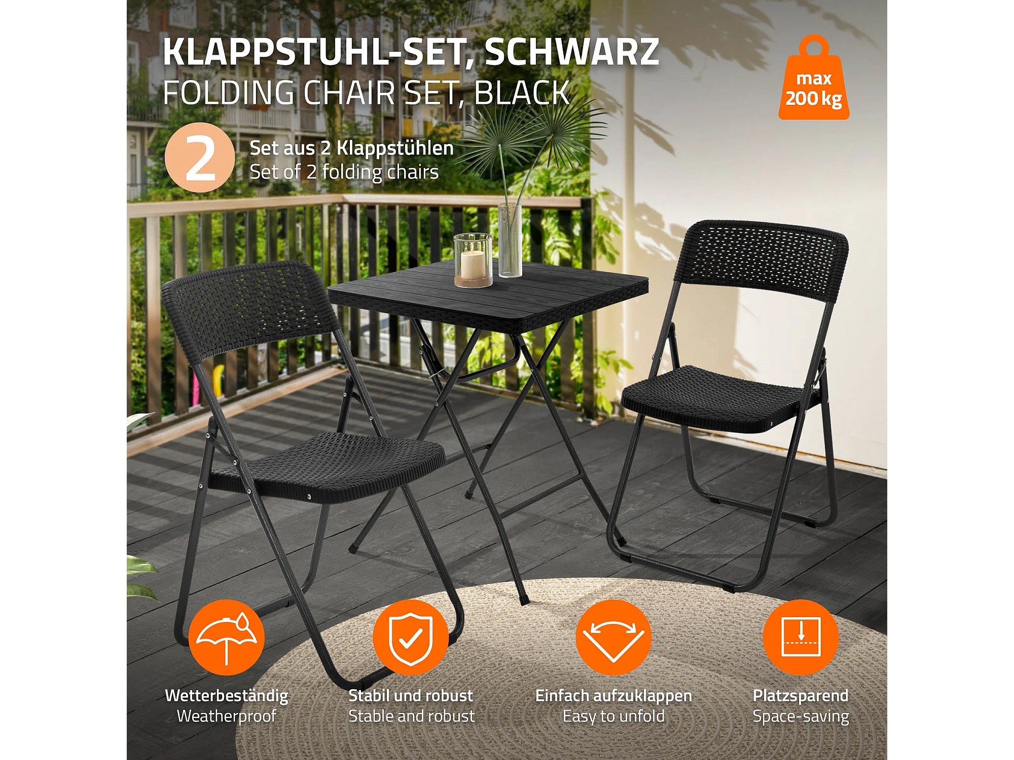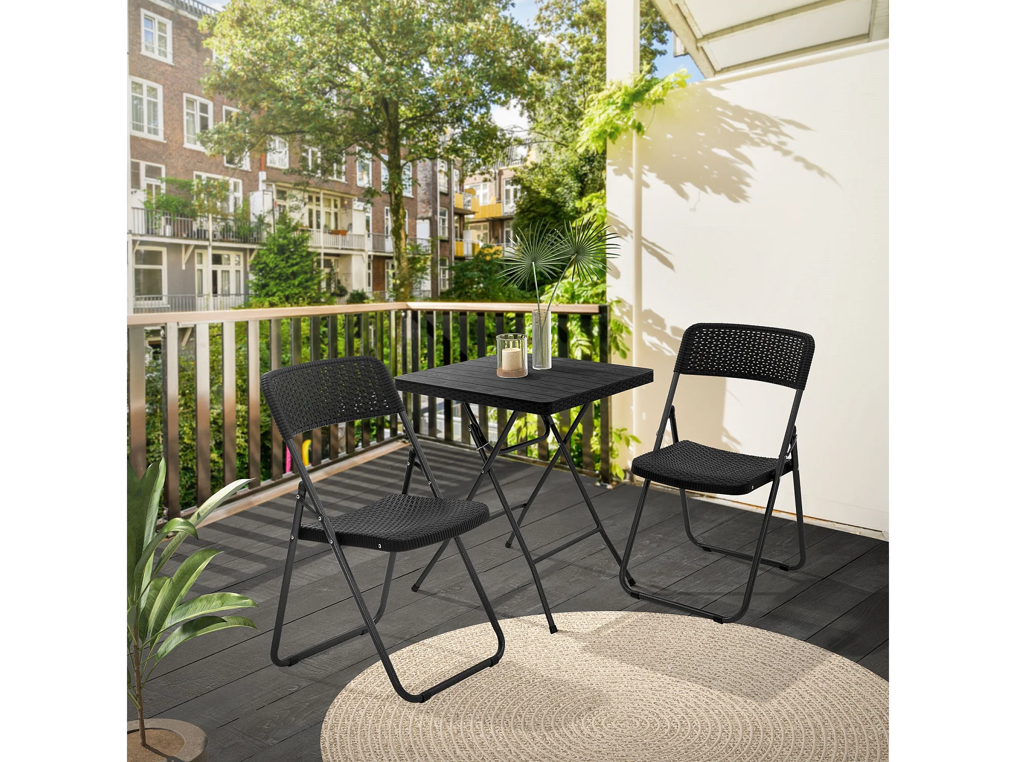 Lot de 2 chaises de terrasse pliantes assise et dossier noir aspect rotin avec cadre métallique gris foncé aspect martelé supporte jusqu'à 200 kg