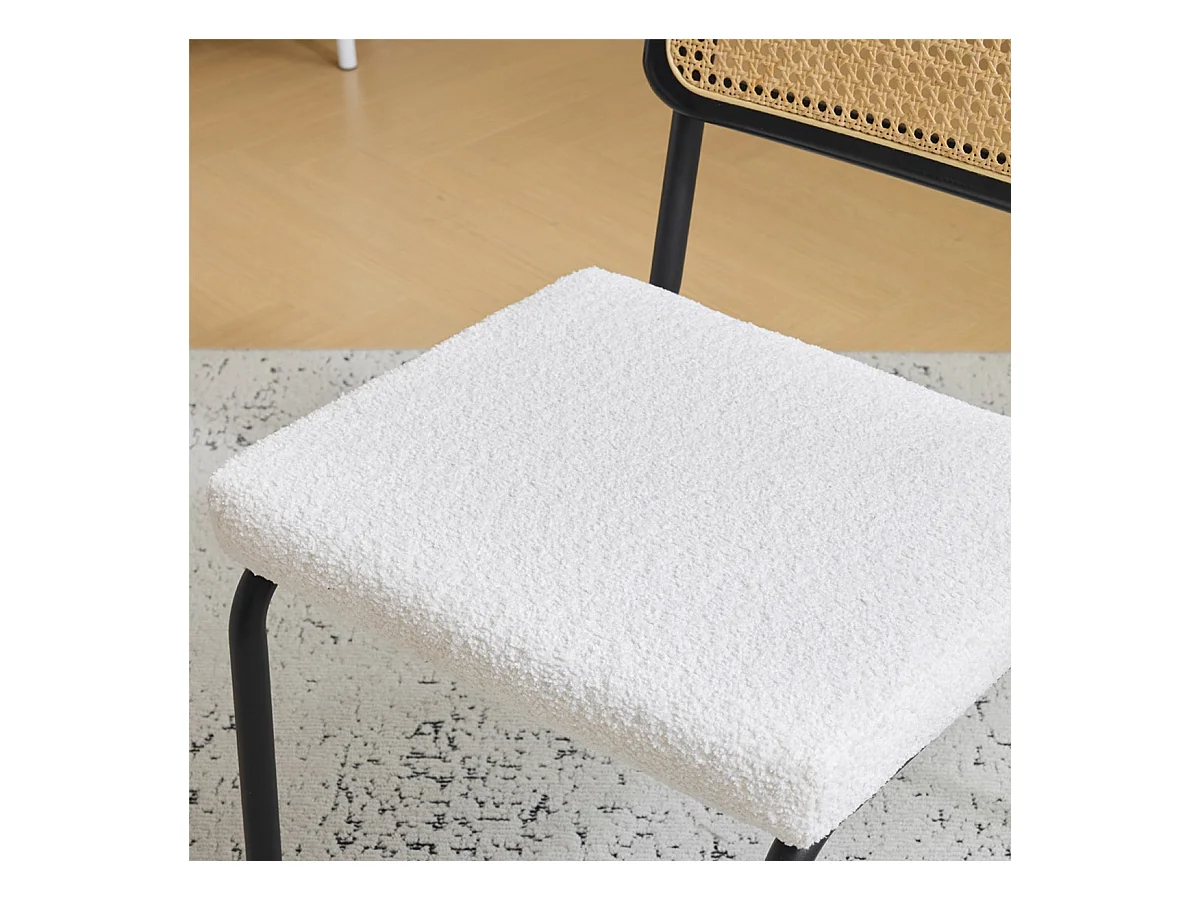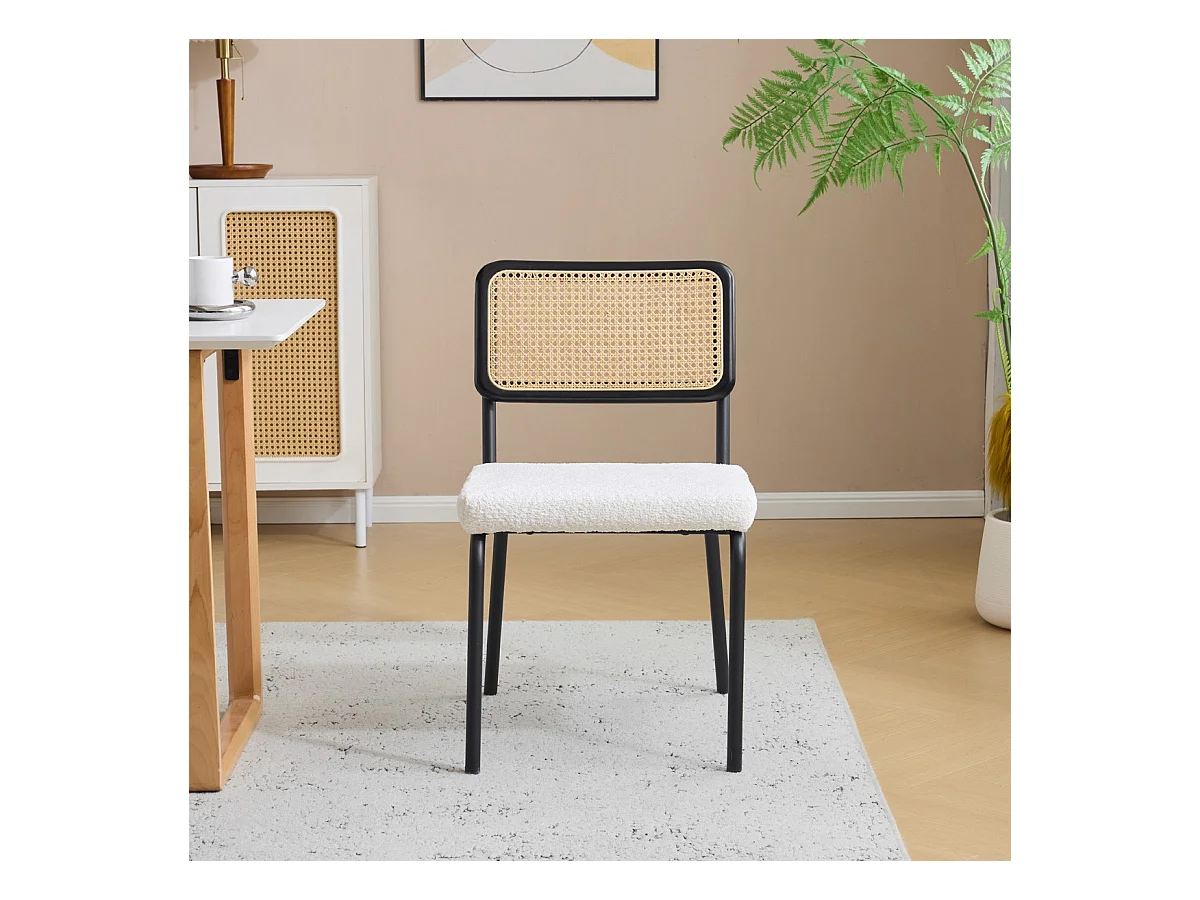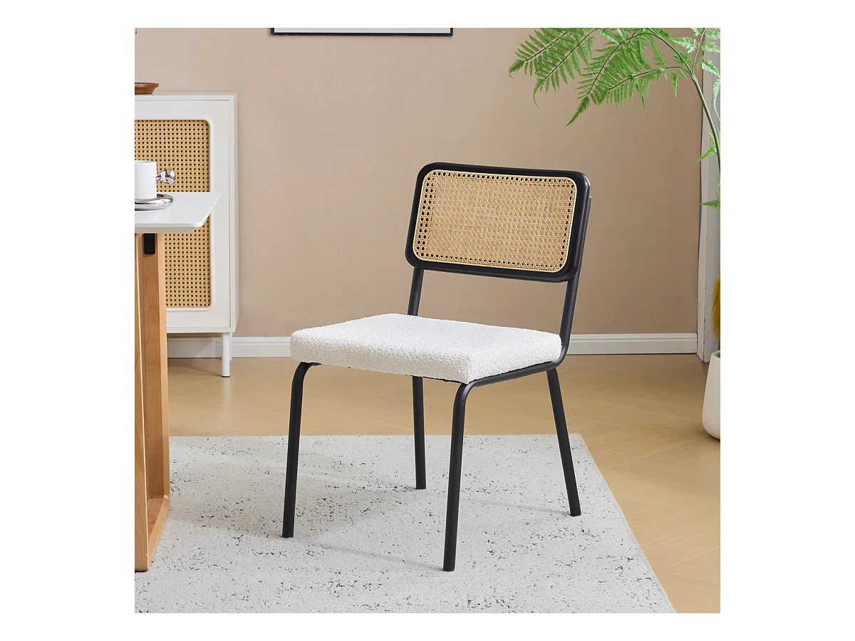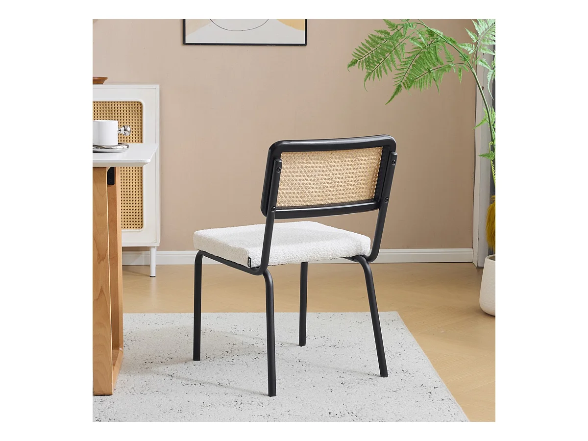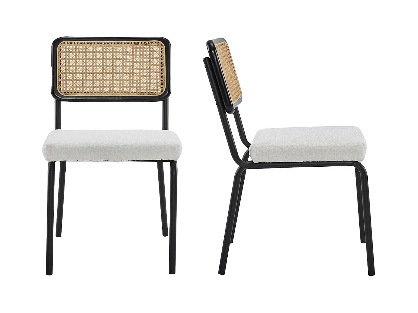 Lot de 2 chaises en métal et bois noir, cannage naturel et tissu bouclé écru - Paula