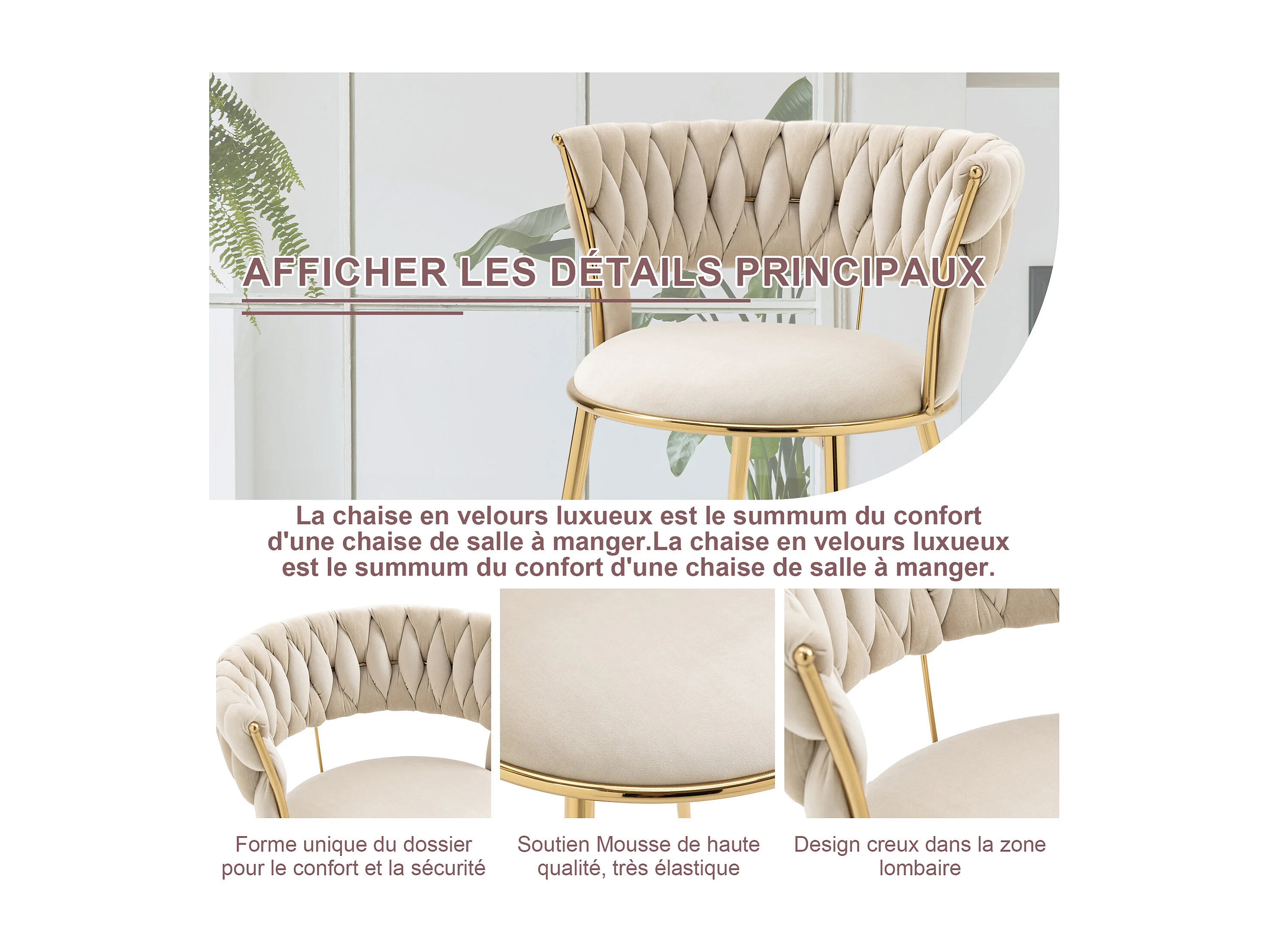 Lot de 2 chaises en velours ivoire - dossier ajouré tressé et pieds dorés - Idéales pour intérieur chic et contemporain