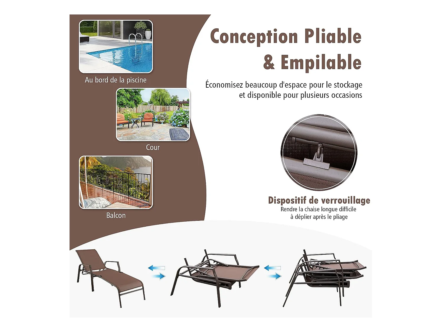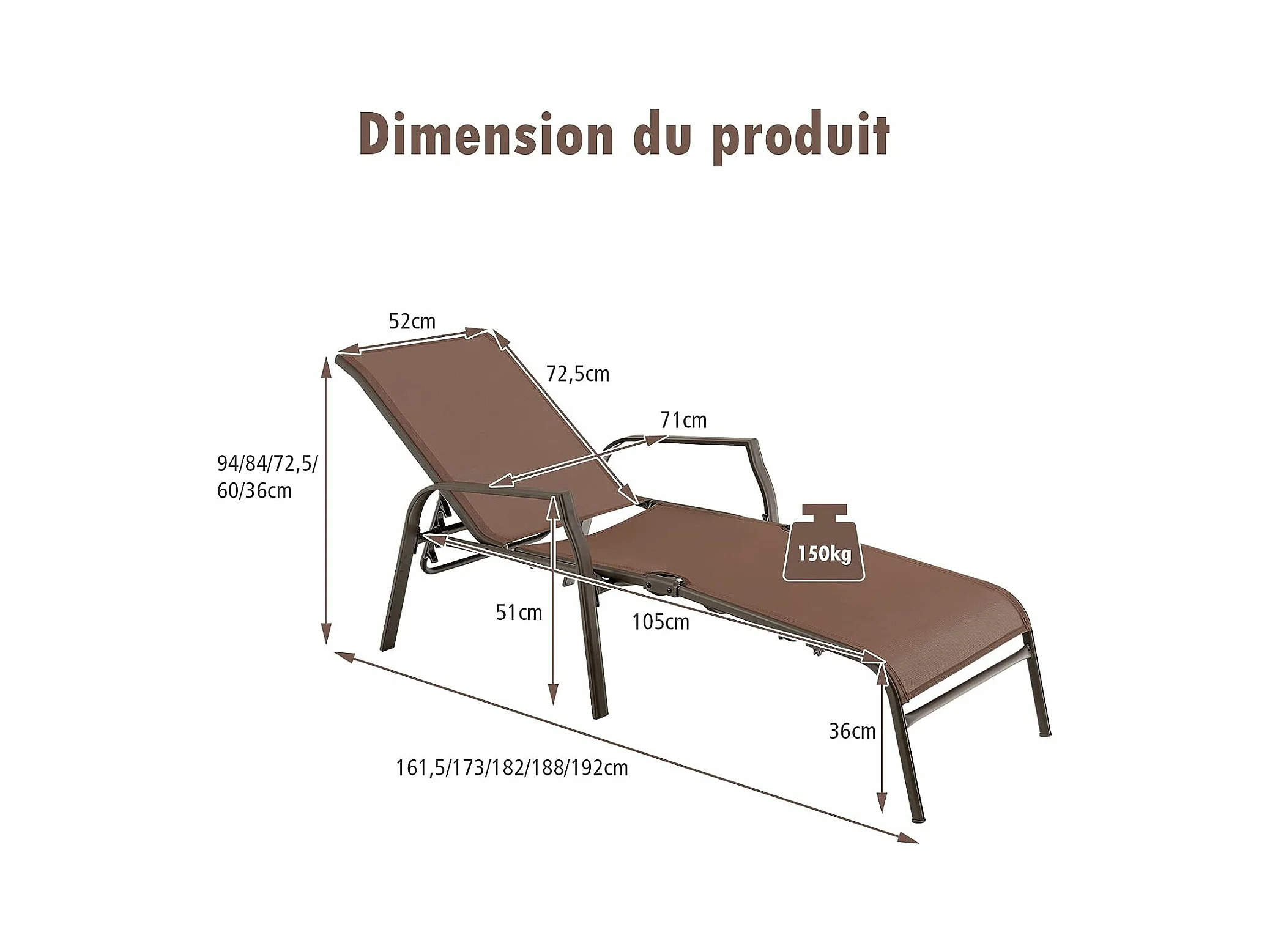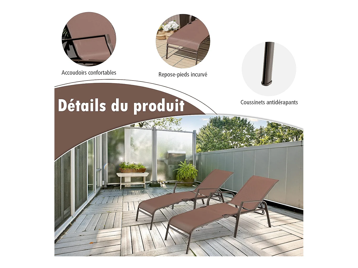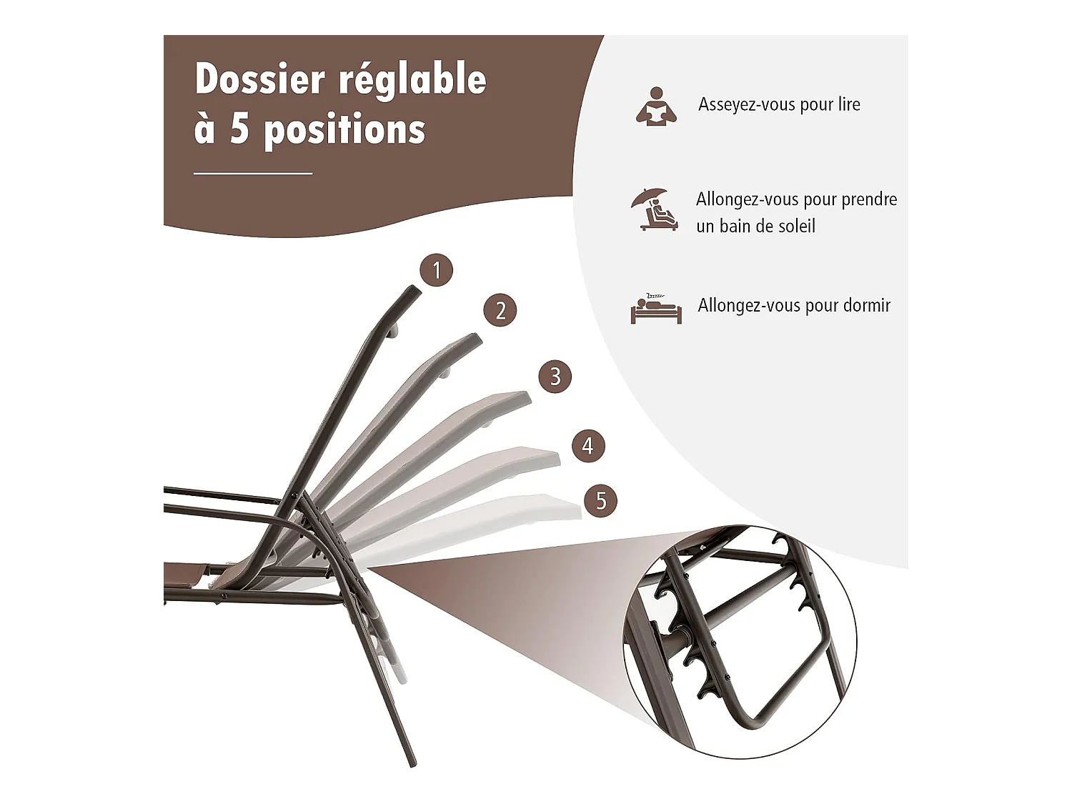 Lot de 2 Chaises longues avec Dossier Réglable, Tissu Respirant, Structure Robuste en Acier, Charge Max 150KG, Marron