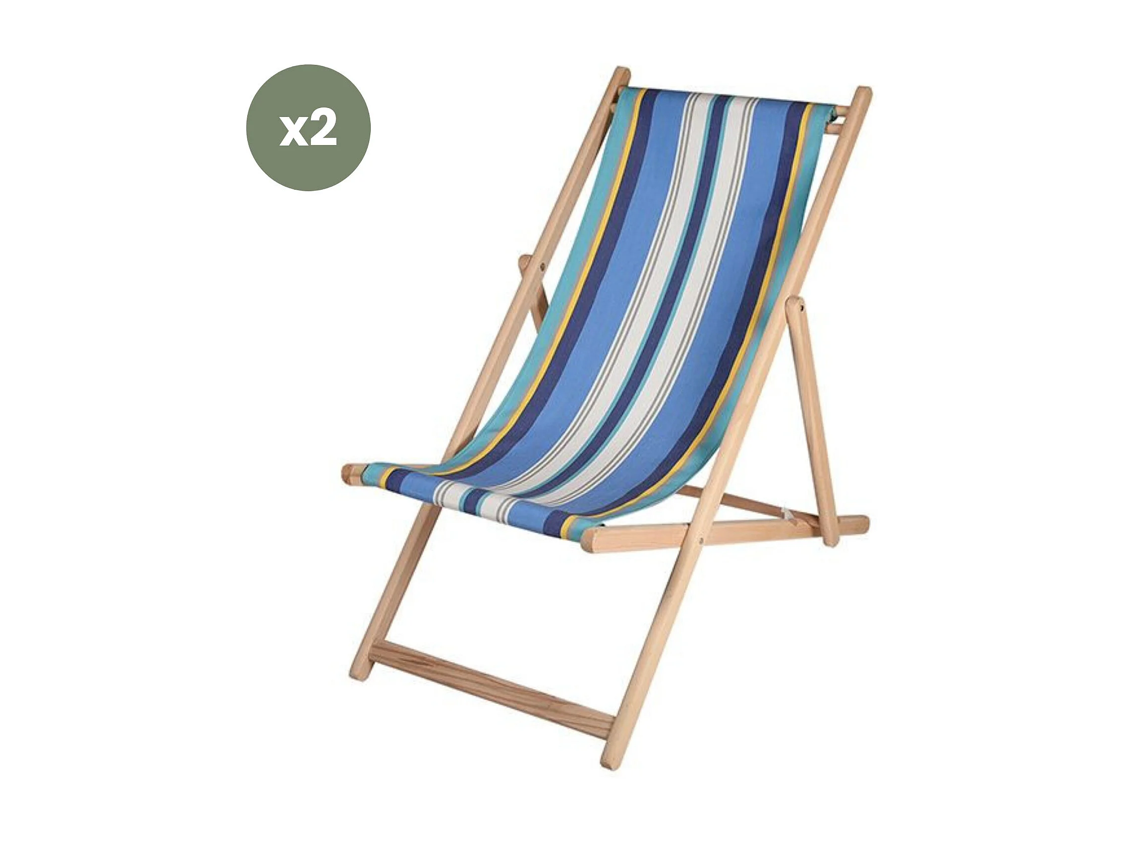 Lot de 2 chiliennes pliantes règlables - 100% acrylique - bois hêtre - Bleu/Blanc - PAROS