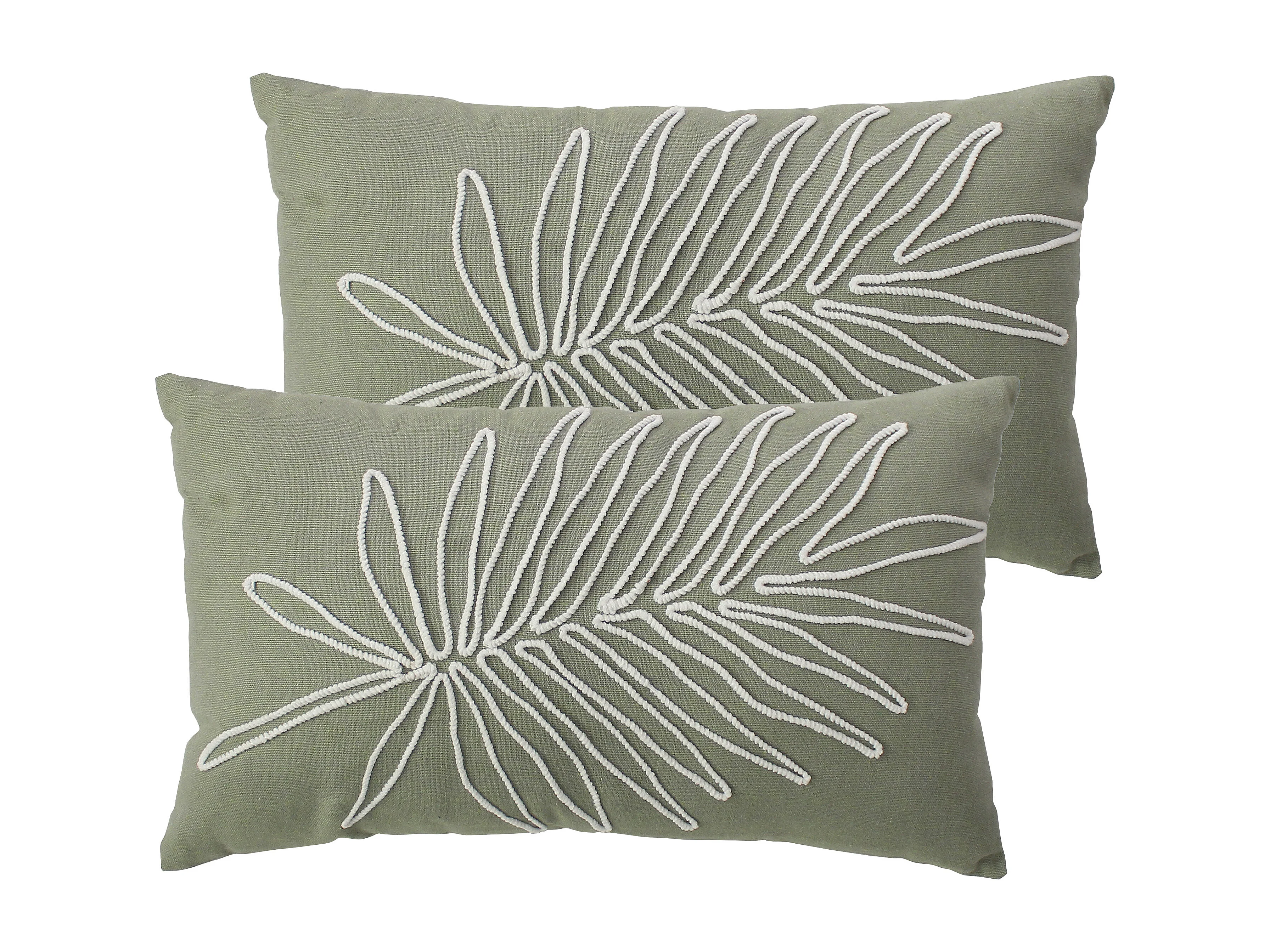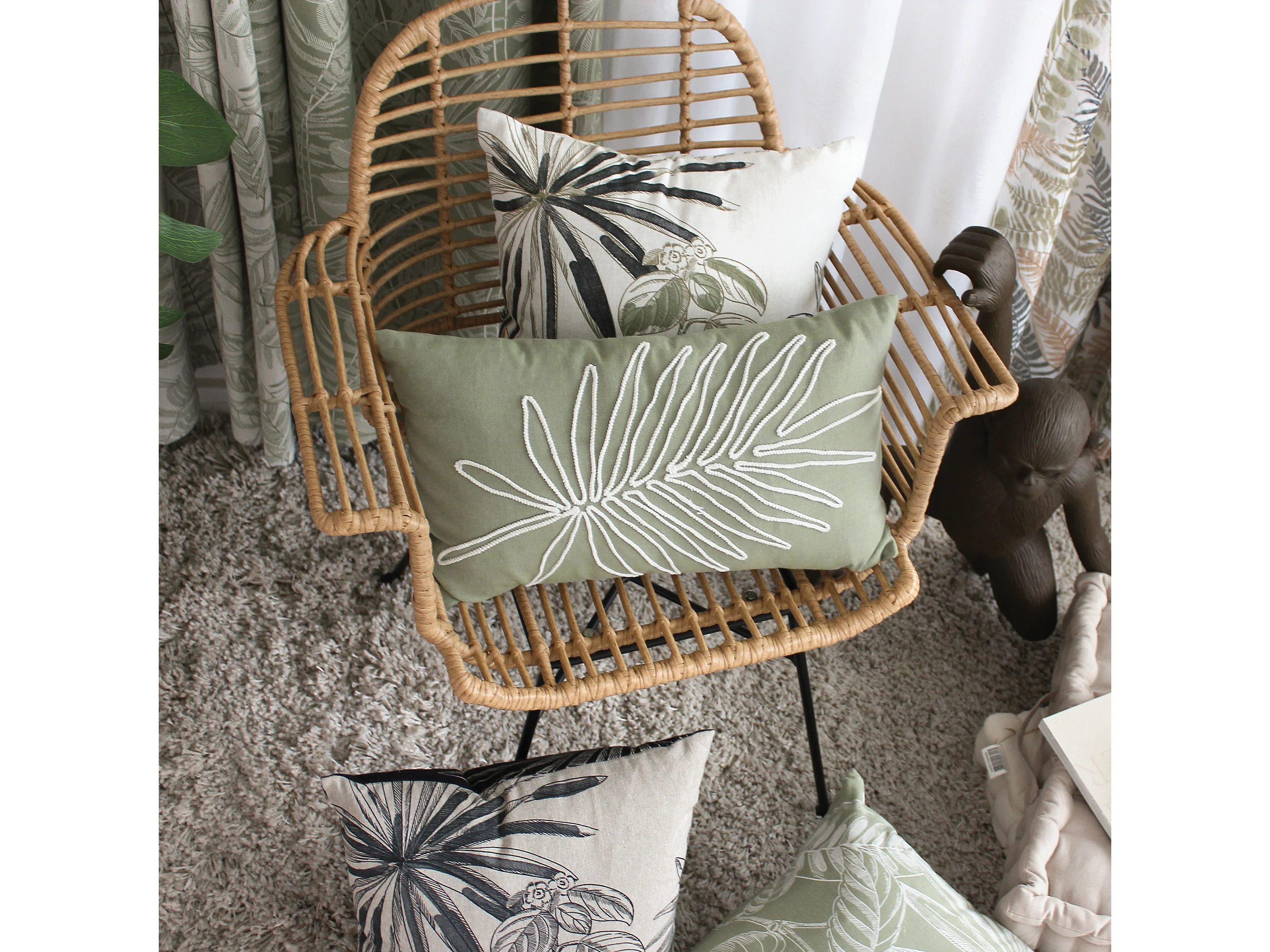 Lot de 2 Coussins déhoussables, rectangulaire 30x50cm, Olive, Broderie feuille Ecru, Collection Mambo