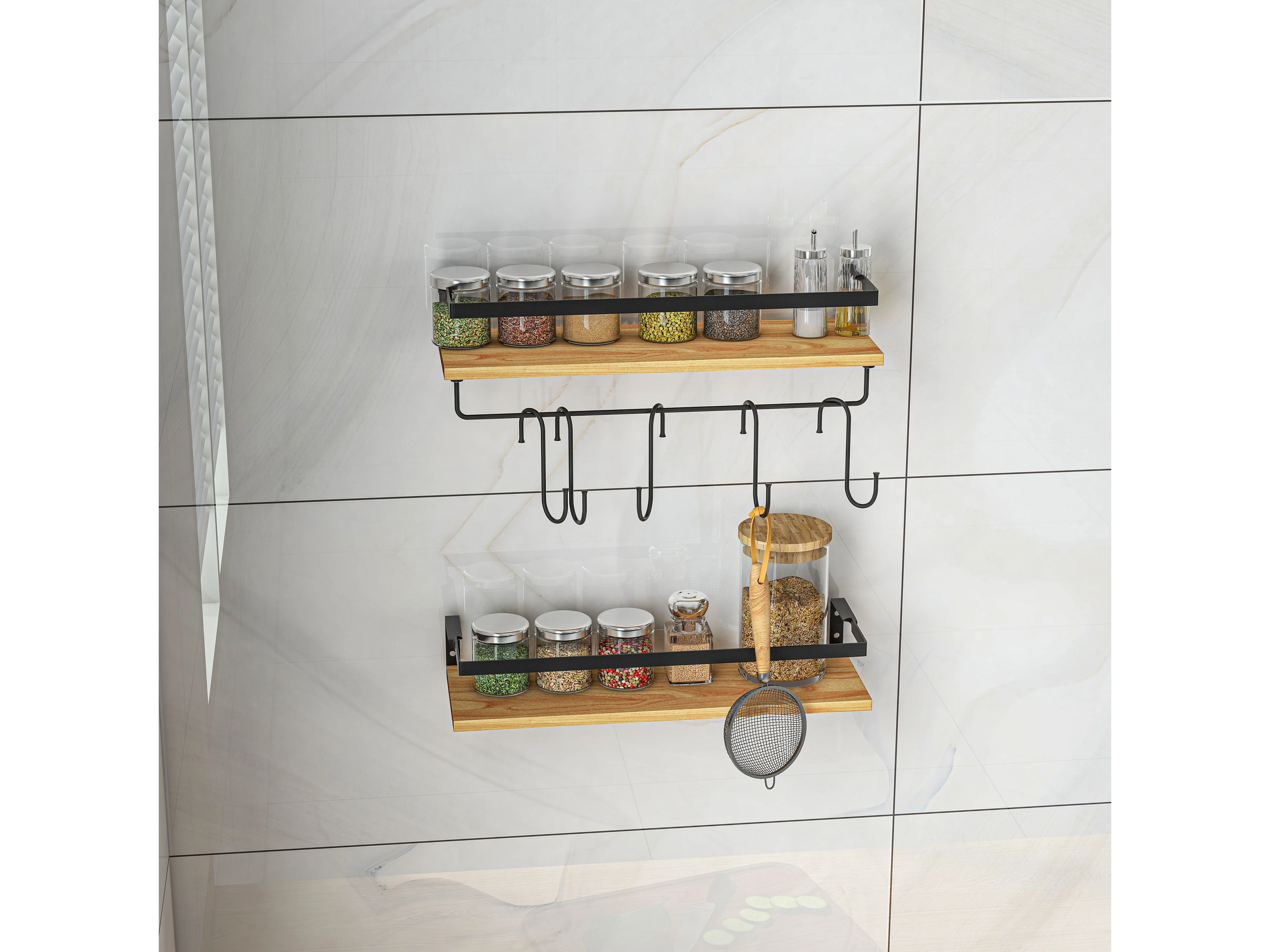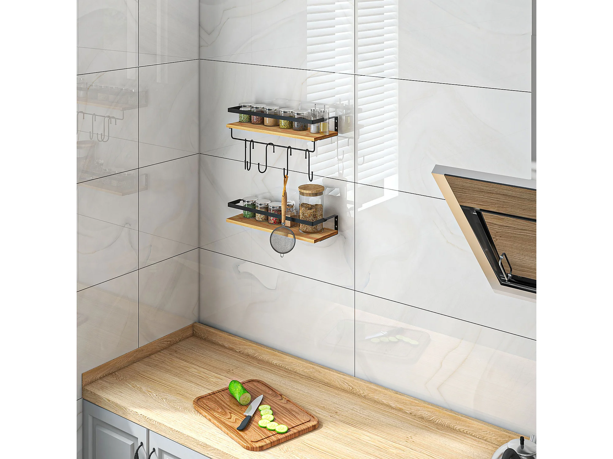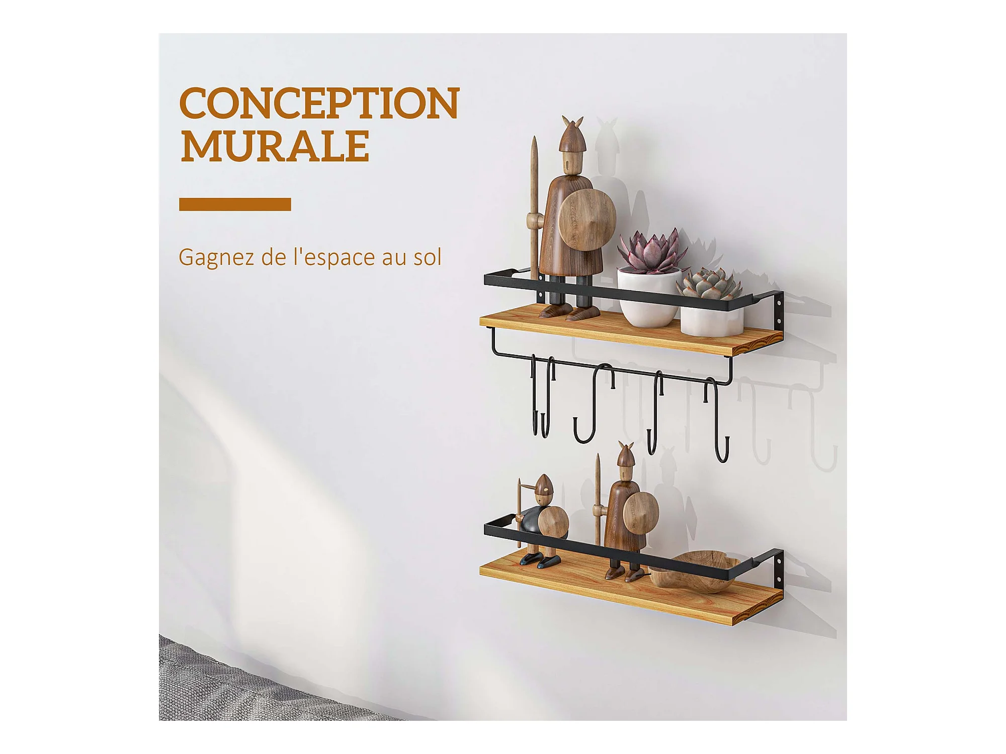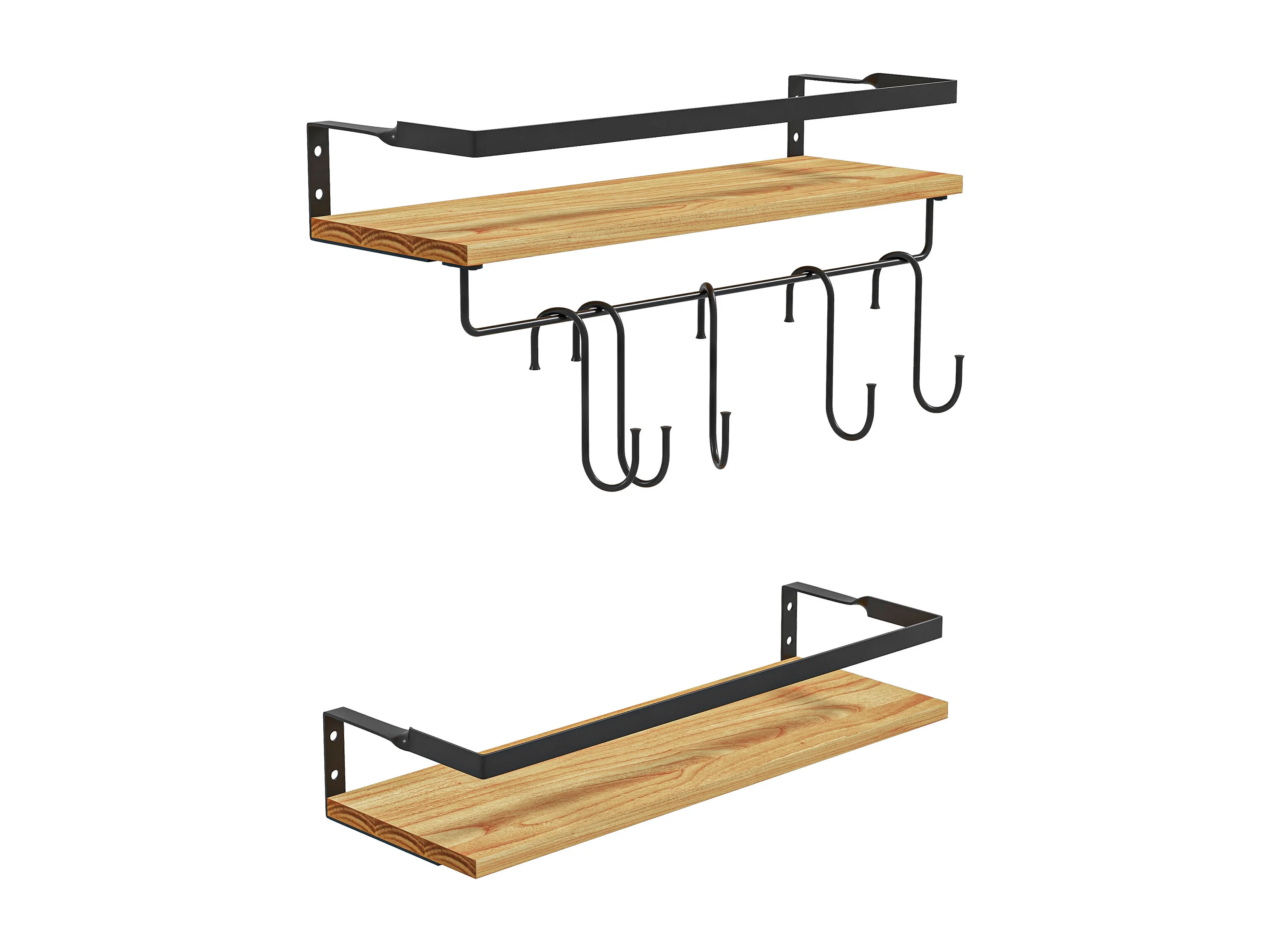 Lot de 2 étagères murales flottantes en bois de sapin et acier noir - étagères de cuisine à ustensiles - 6 crochets amovibles