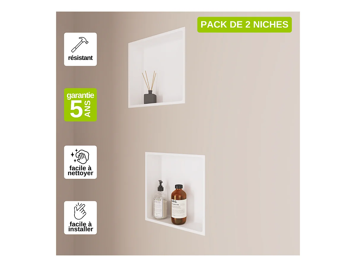 Lot de 2 Niches de Douche, Rangement mural de Salle de Bain et Douche 30x30cm Blanc Satiné, NOOK by SANIZÉO