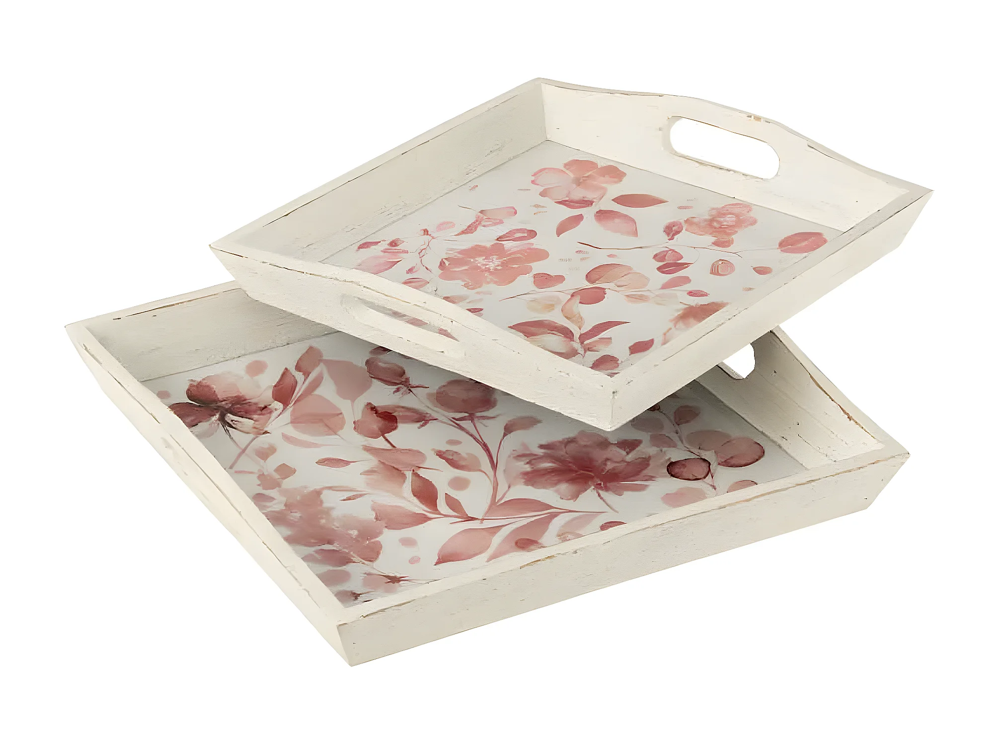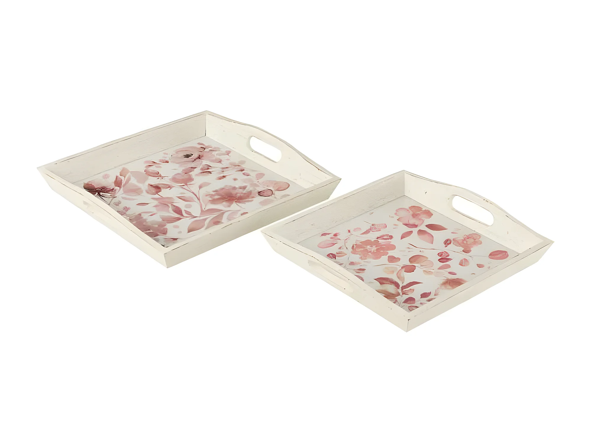 Lot de 2 Plateaux "Motif Fleurs" 41cm Rose & Blanc