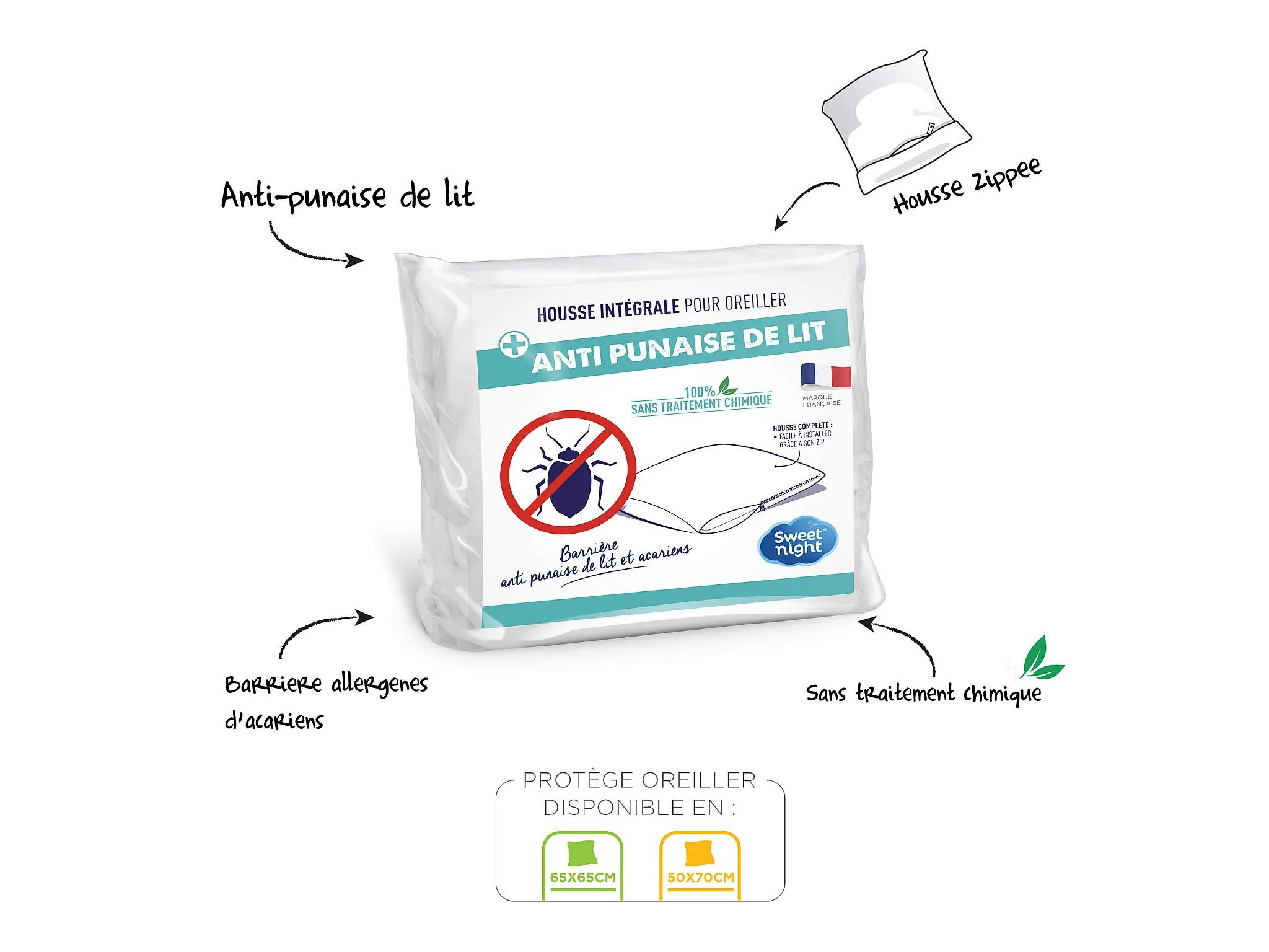 Protège oreiller anti-acariens et anti-punaises sans traitement 65x65