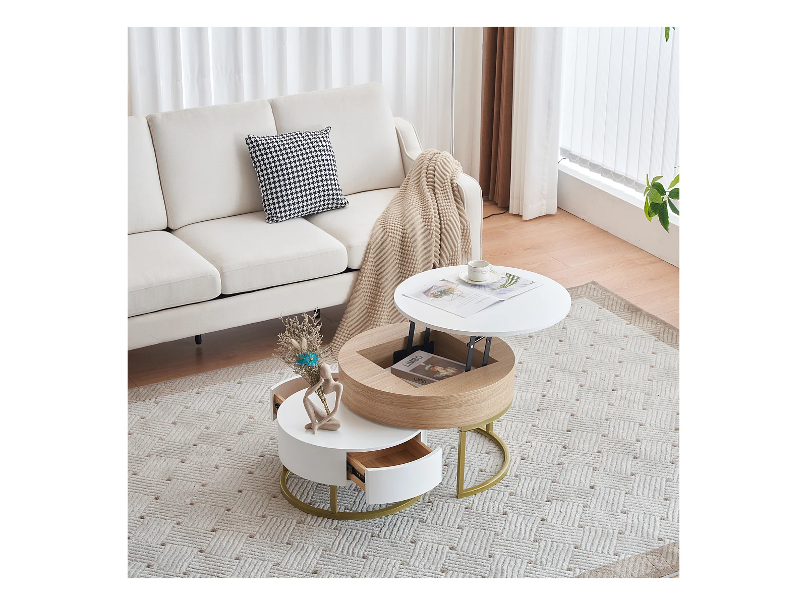 Lot de 2 table basse gigogne, grand table avec plateau relevable, petie table avec 2 tiroirs, MDF, blanc