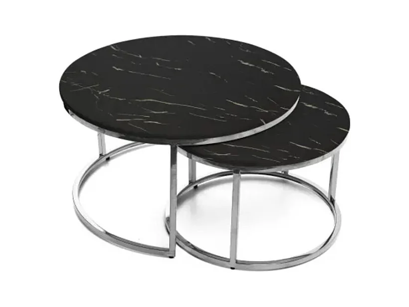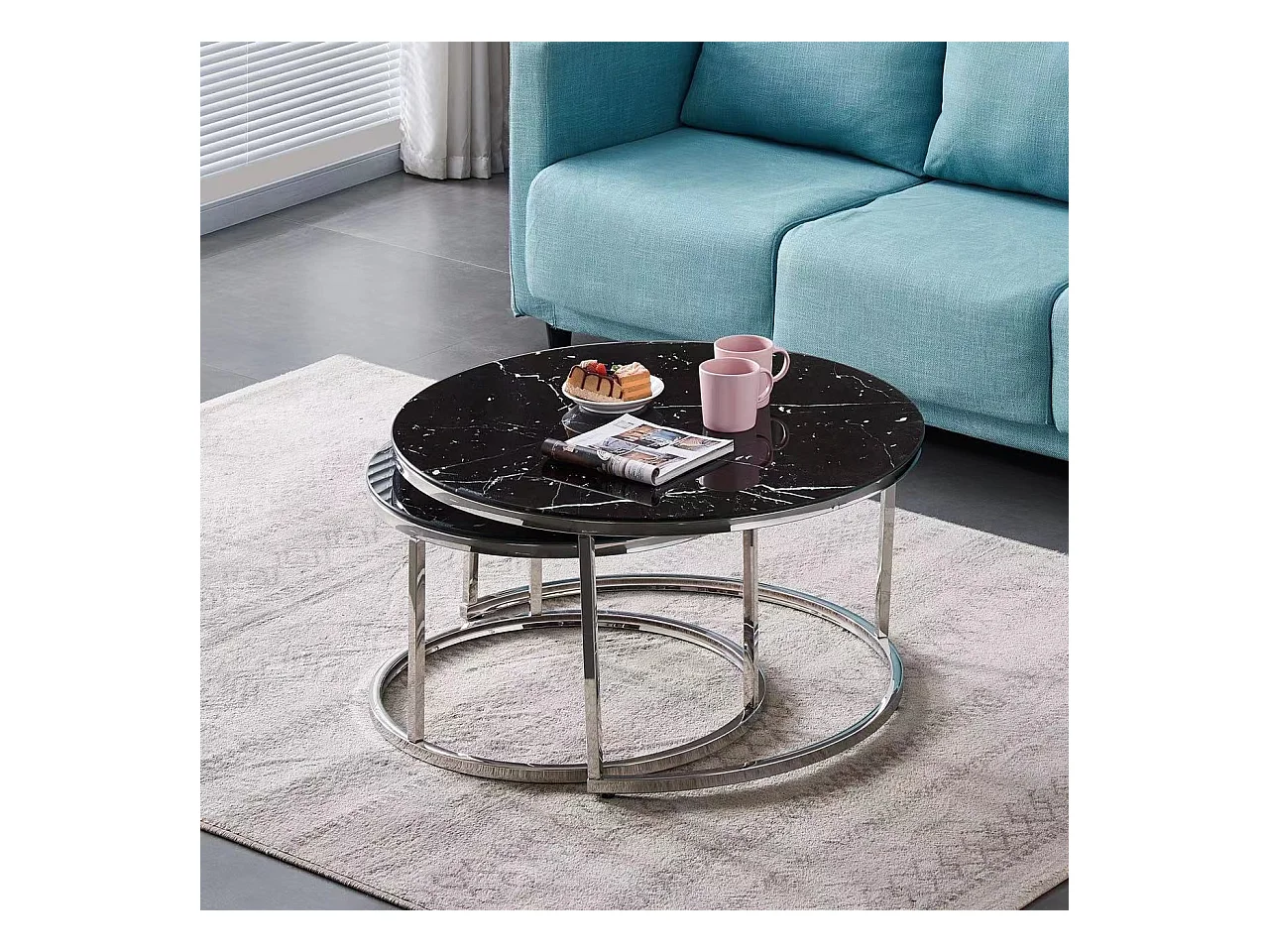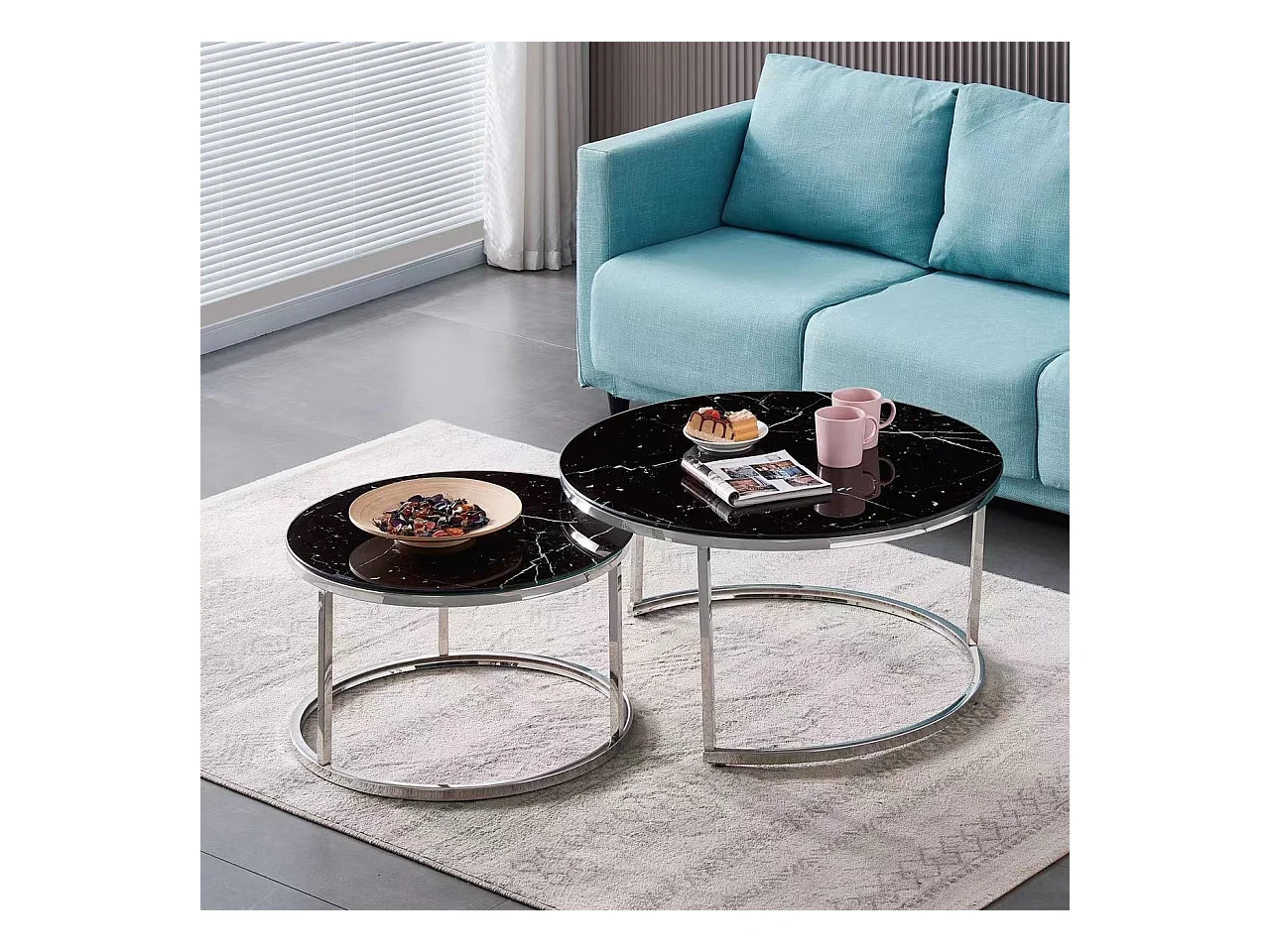 Lot de 2 tables Basses Gigogne ARTO inox et plateau en verre MARBRE NOIR