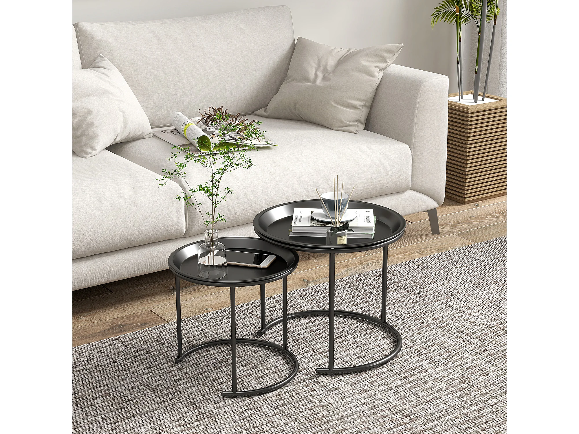 Lot de 2 tables basses gigognes rondes design contemporain encastrable plateaux amovibles acier noir