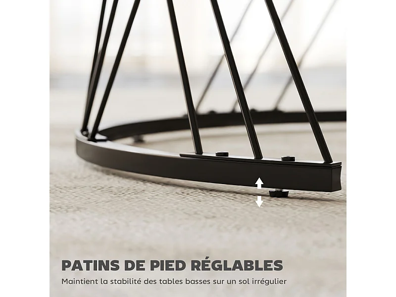Table basse 2 en 1 ronde, MDF, avec plateau en verre transparent et marbré, 2 tiroirs, noir et gris (70x70x45 + 50x50x40 cm)