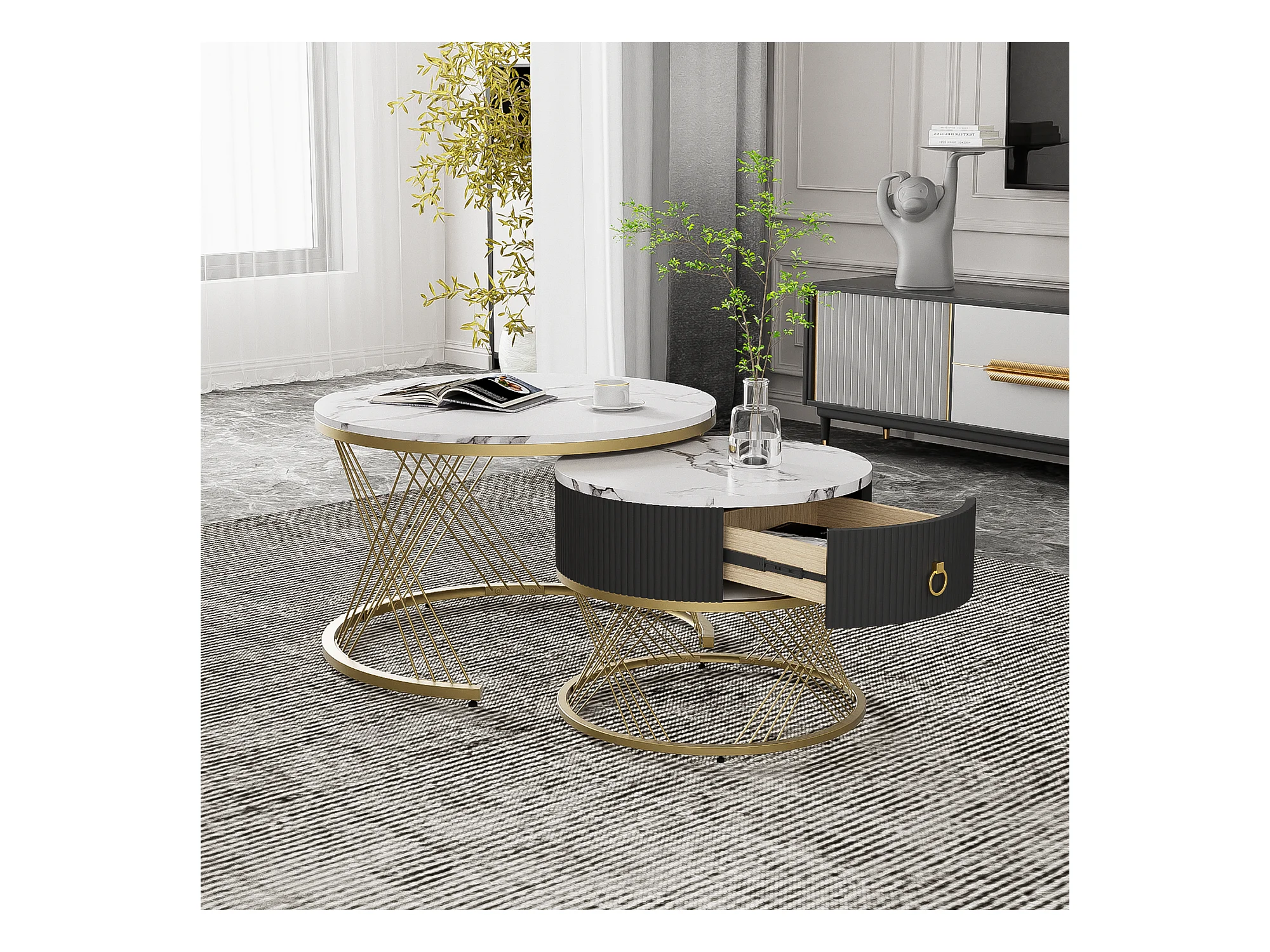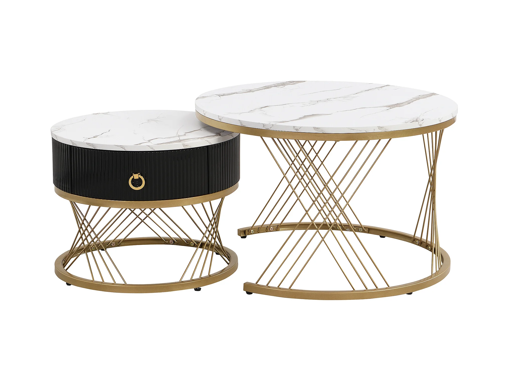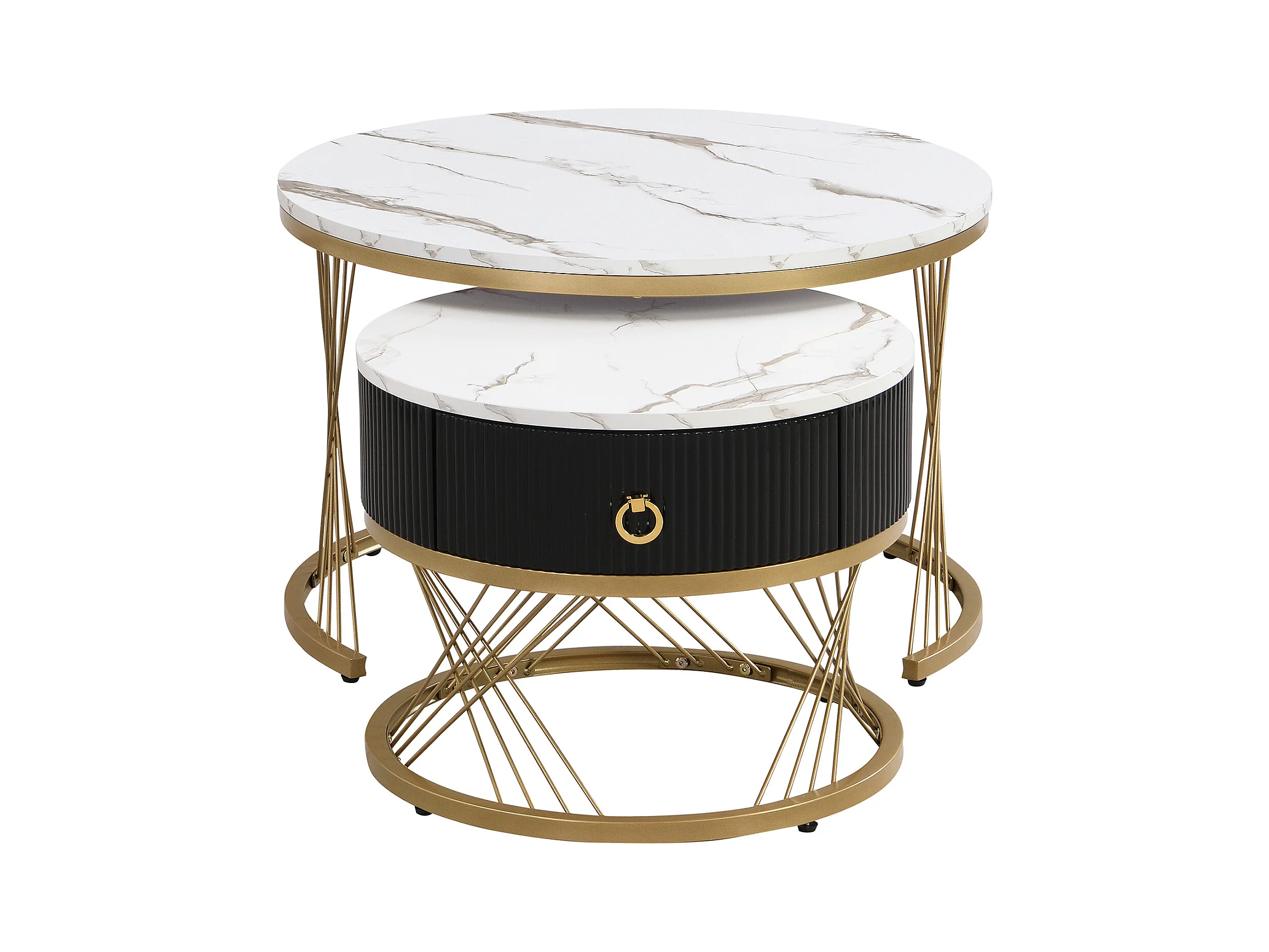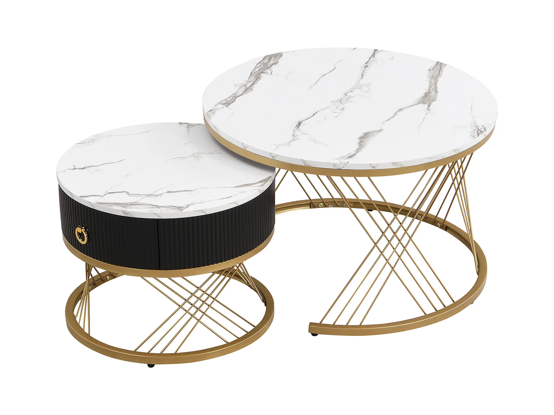 Lot de 2 Tables Basses gigognes, Table Basse avec tiroir Noir et des Accents dorés , Blanc&Noir