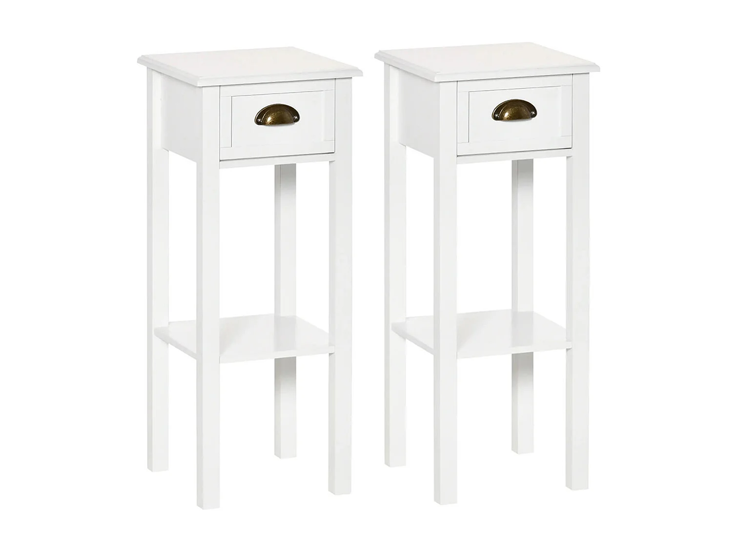 Lot de 2 Tables d'appoint Bout de canapé guéridon tiroir étagère poignées coquilles Laiton vieilli MDF blanc