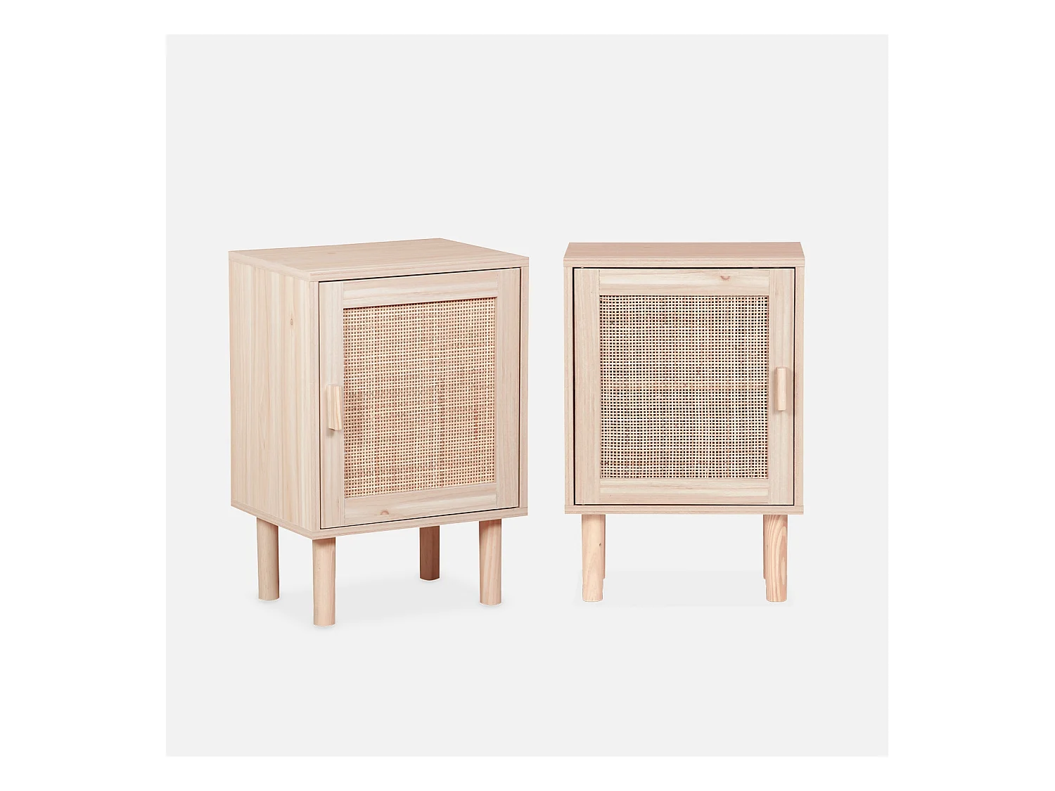 Lot de 2 tables de chevet. Eva. décor bois et cannage arrondi. une porte. un espace de rangement. L40 x l39 x H65.8cm