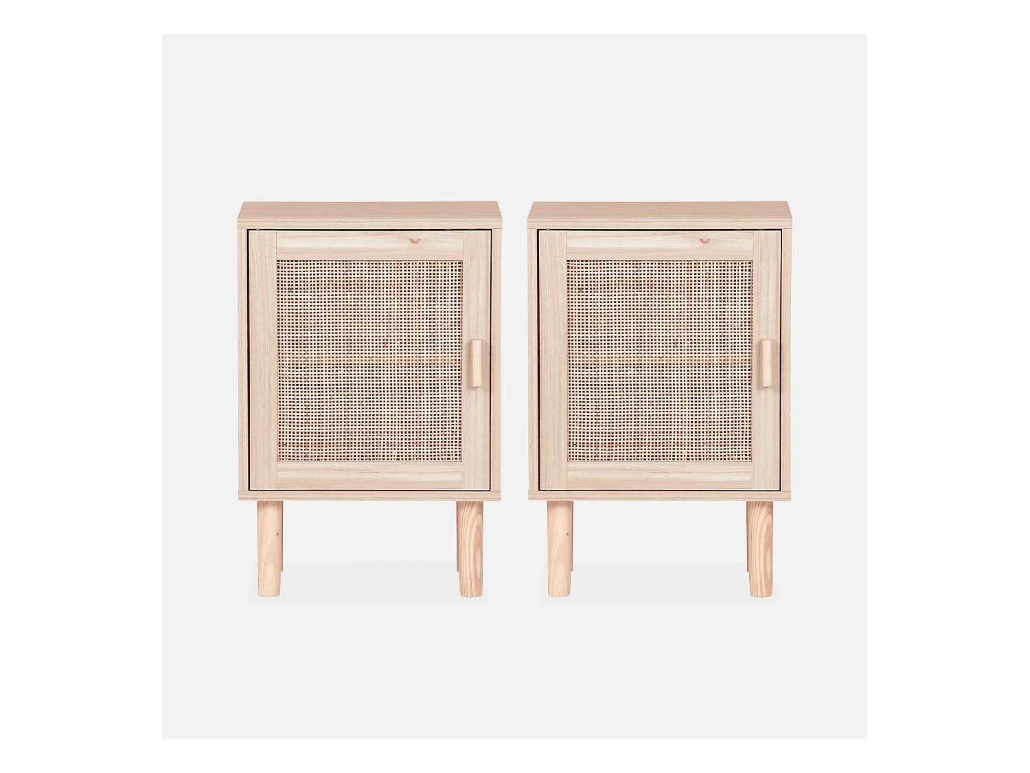 Lot de 2 tables de chevet en cannage et décor bois - Camargue - 40x30x58cm. 2 niveaux. 1 porte. pieds droits