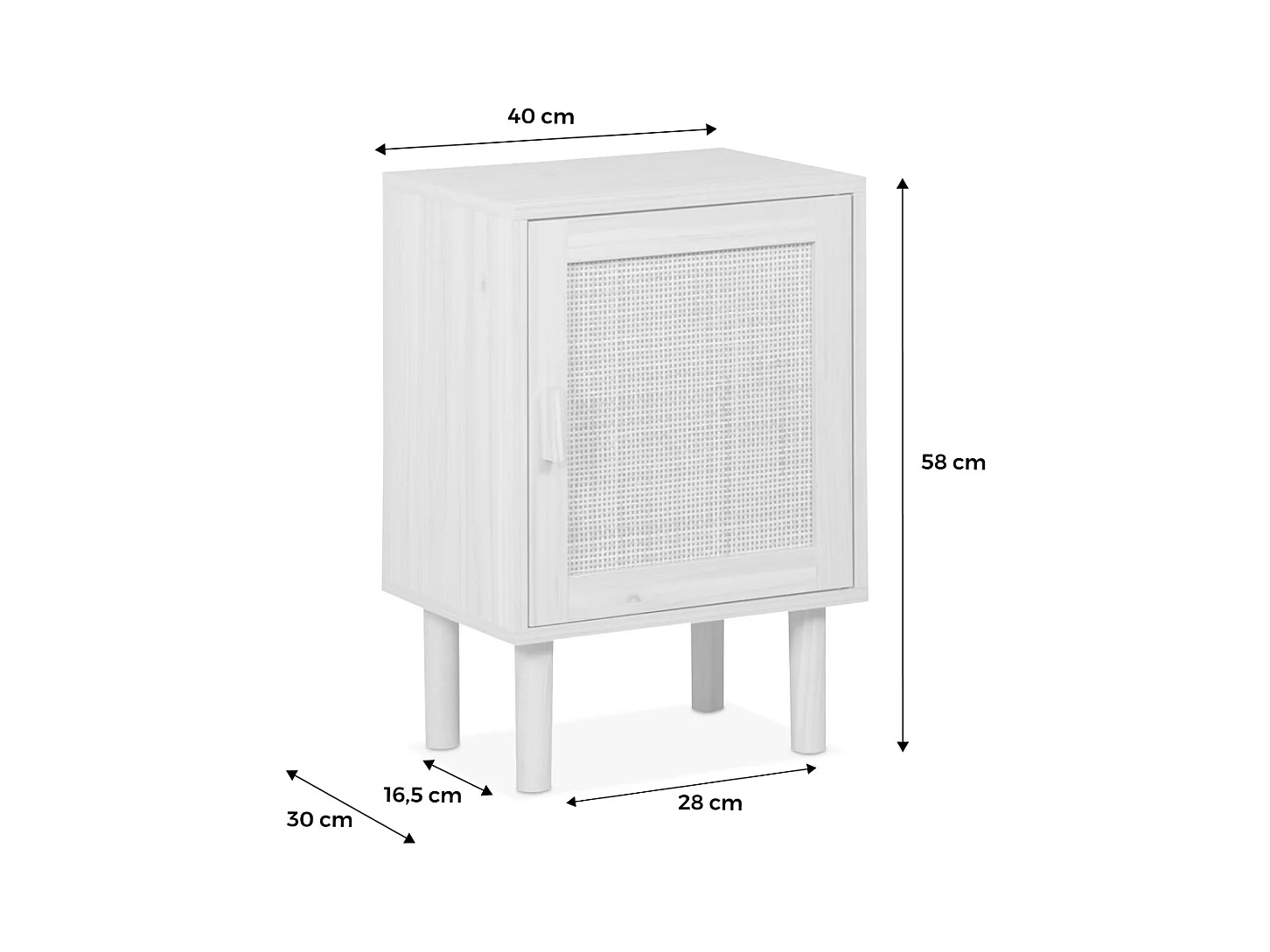 Table de chevet en cannage - Bohème - 40x39x70cm. couleur noyer - 2 niveaux - 1 porte - 1 espace de rangement - pieds scandinaves