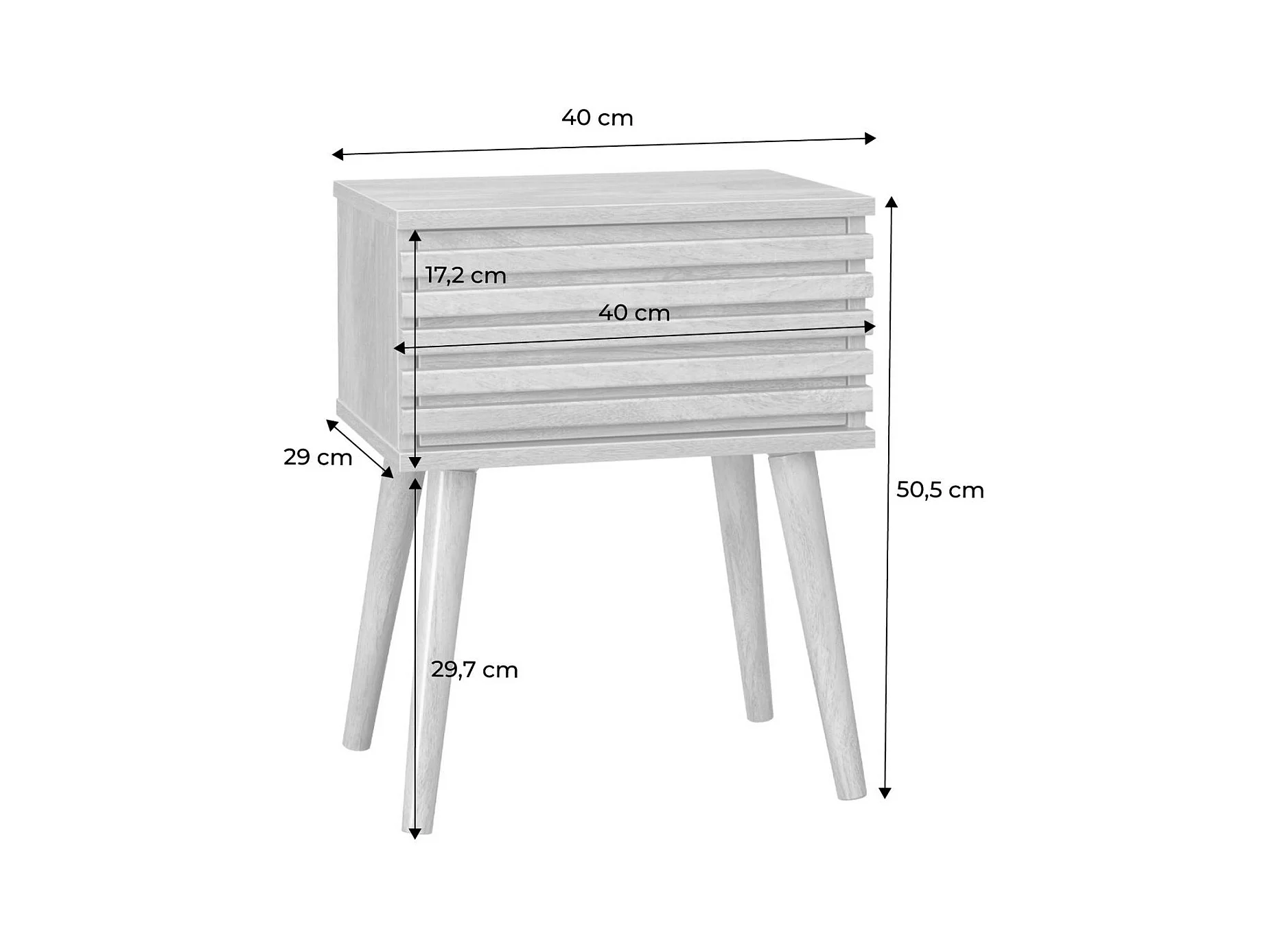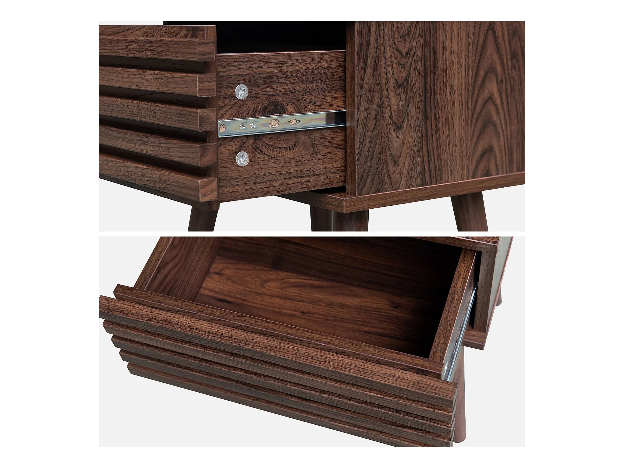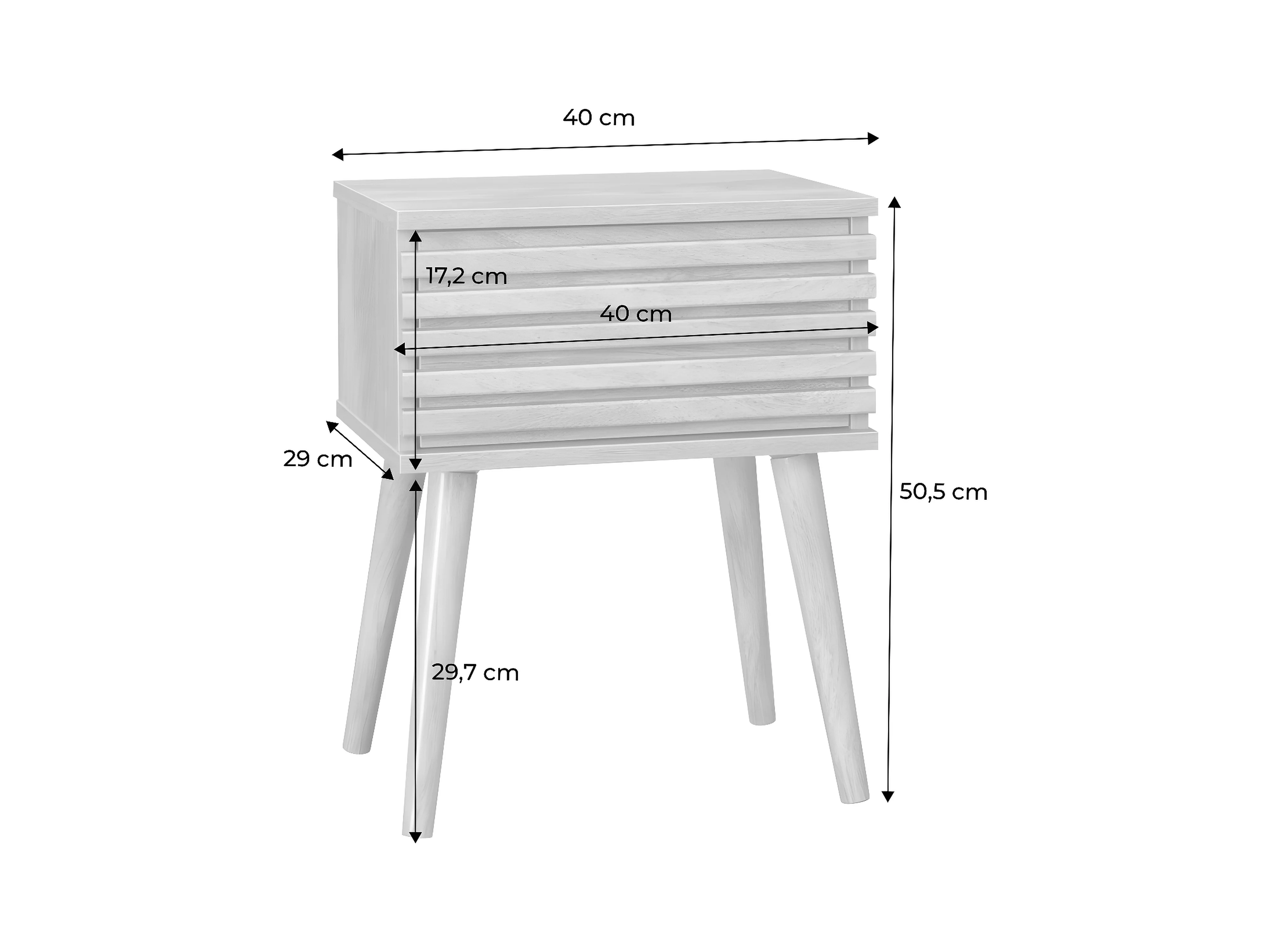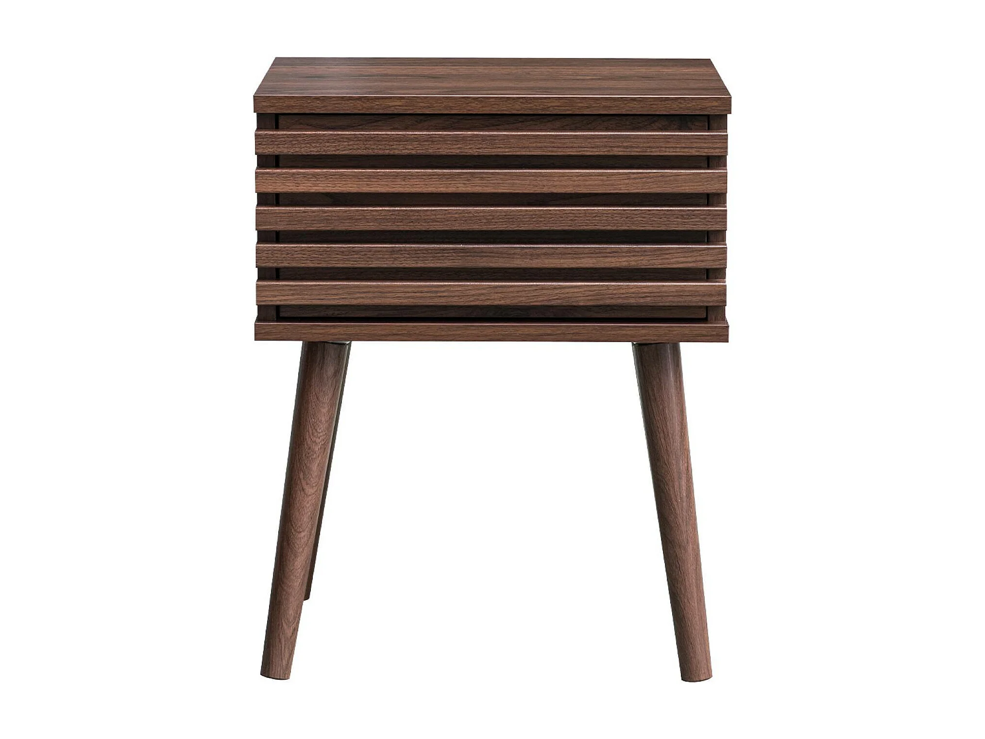 Table de chevet style scandinave décor bois couleur noyer avec tiroir rainuré et pieds compas
