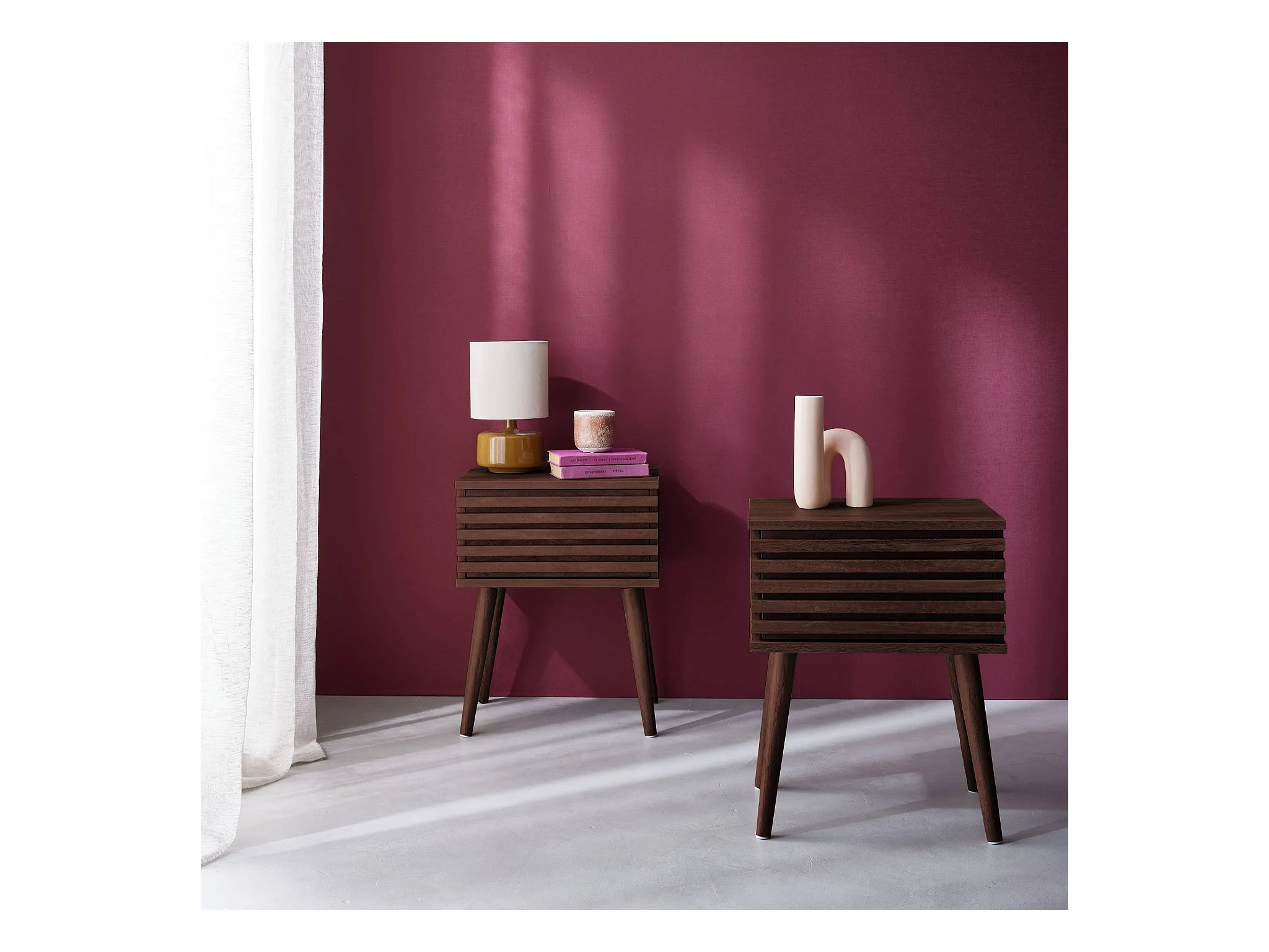 Lot de 2 tables de chevet style scandinave décor bois avec tiroir rainuré noyer et pieds compas