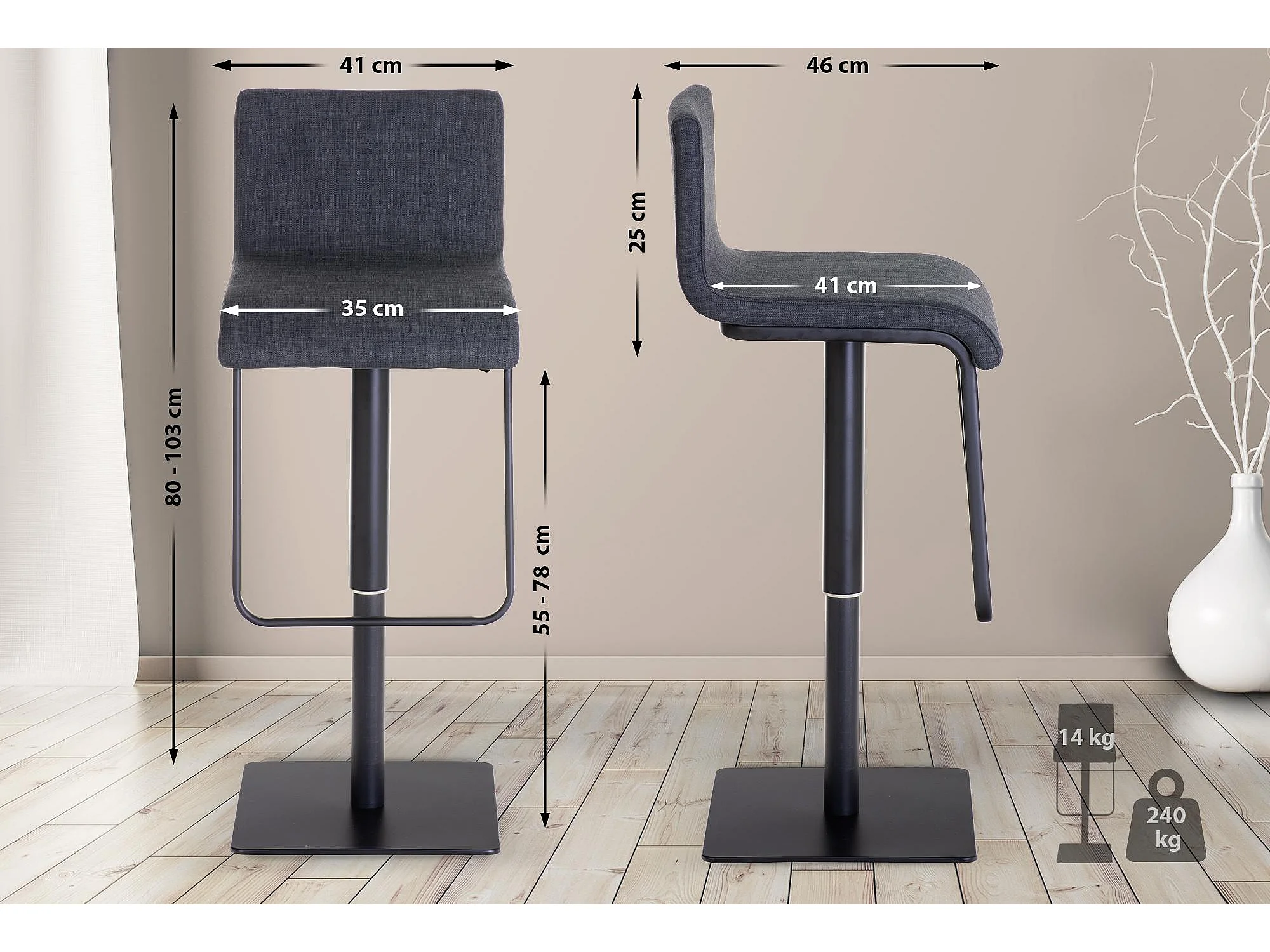 Lot de 2 Tabouret de bar - Tissu & Noir - Gris foncé - Limon