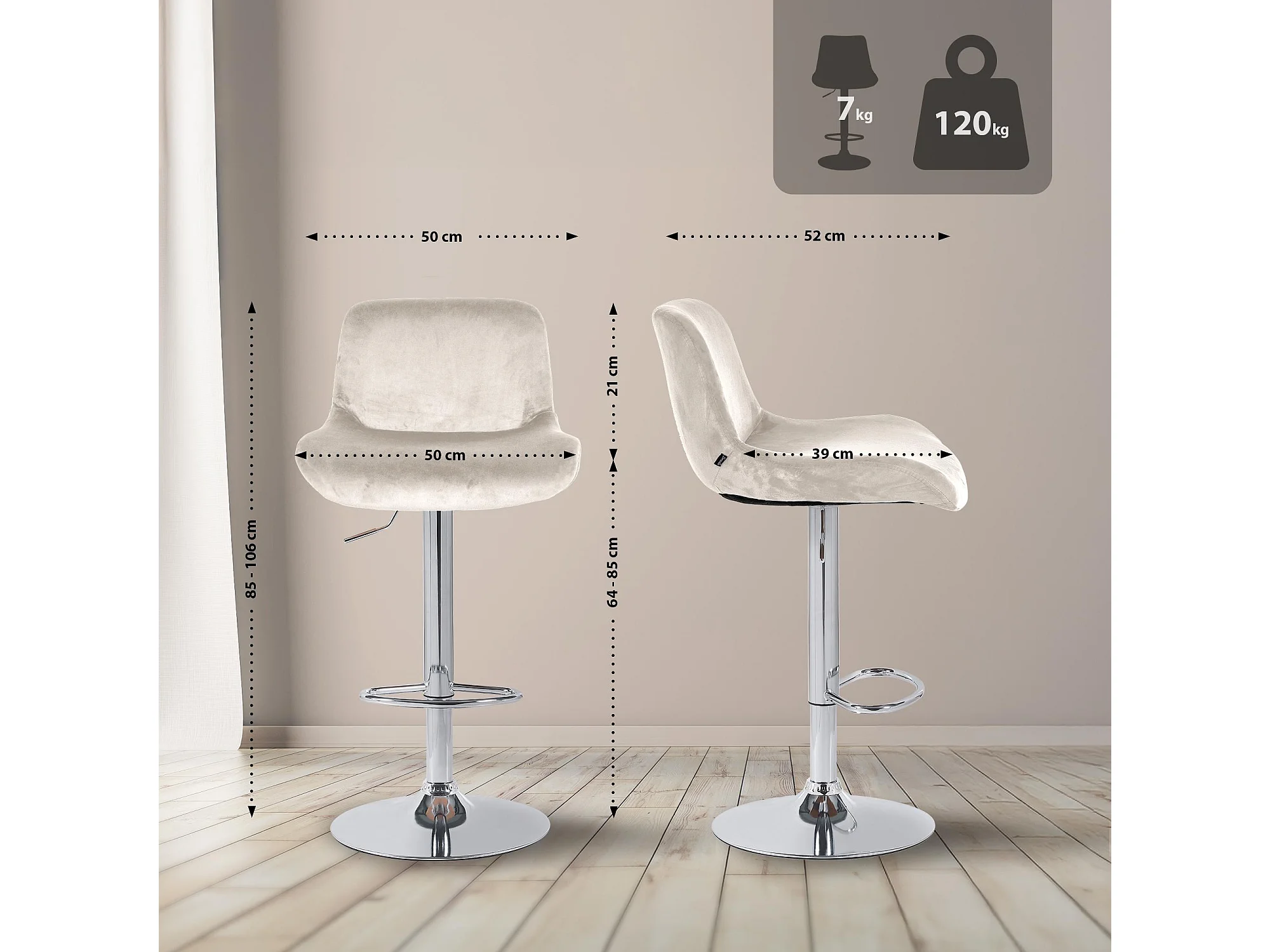 Lot de 2 Tabouret de bar - Velours - Crème - Linus