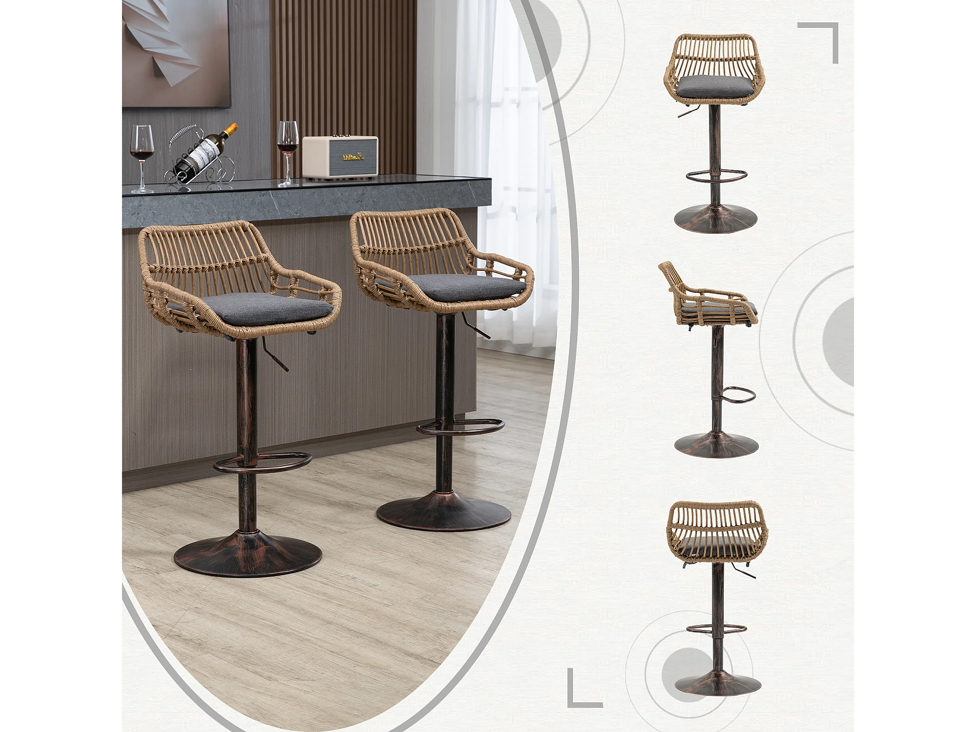 Lot de 2 Tabourets de Bar – Assise en Lin Gris – Base Métallique Marron – Design en Rotin – Confort Optimal