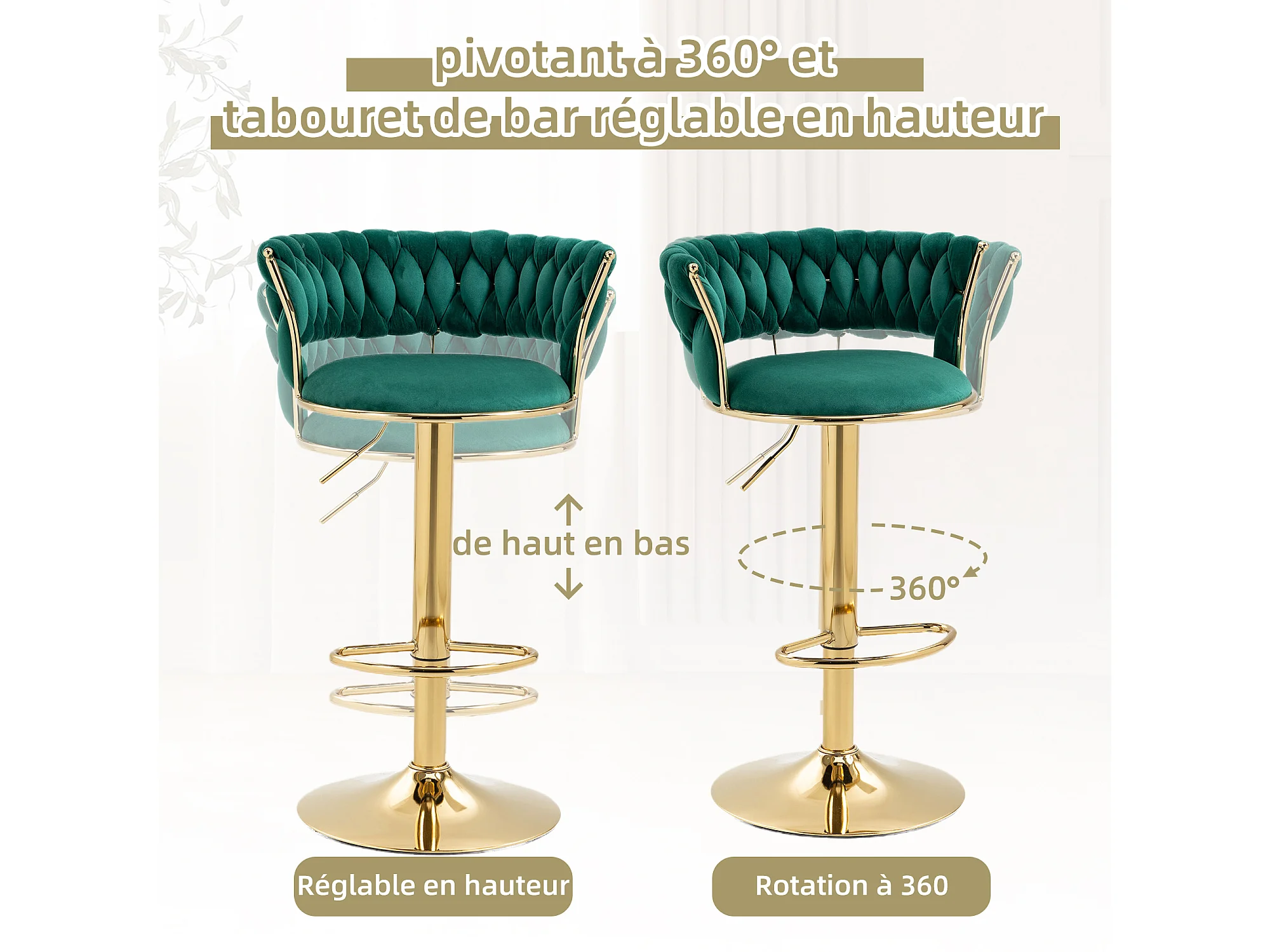 Lot de 2 Tabourets de Bar – Assise Tissée Verte – Pieds Dorés – Hauteur Réglable – 360° Rotatifs – Idéal pour Cuisine et Bar