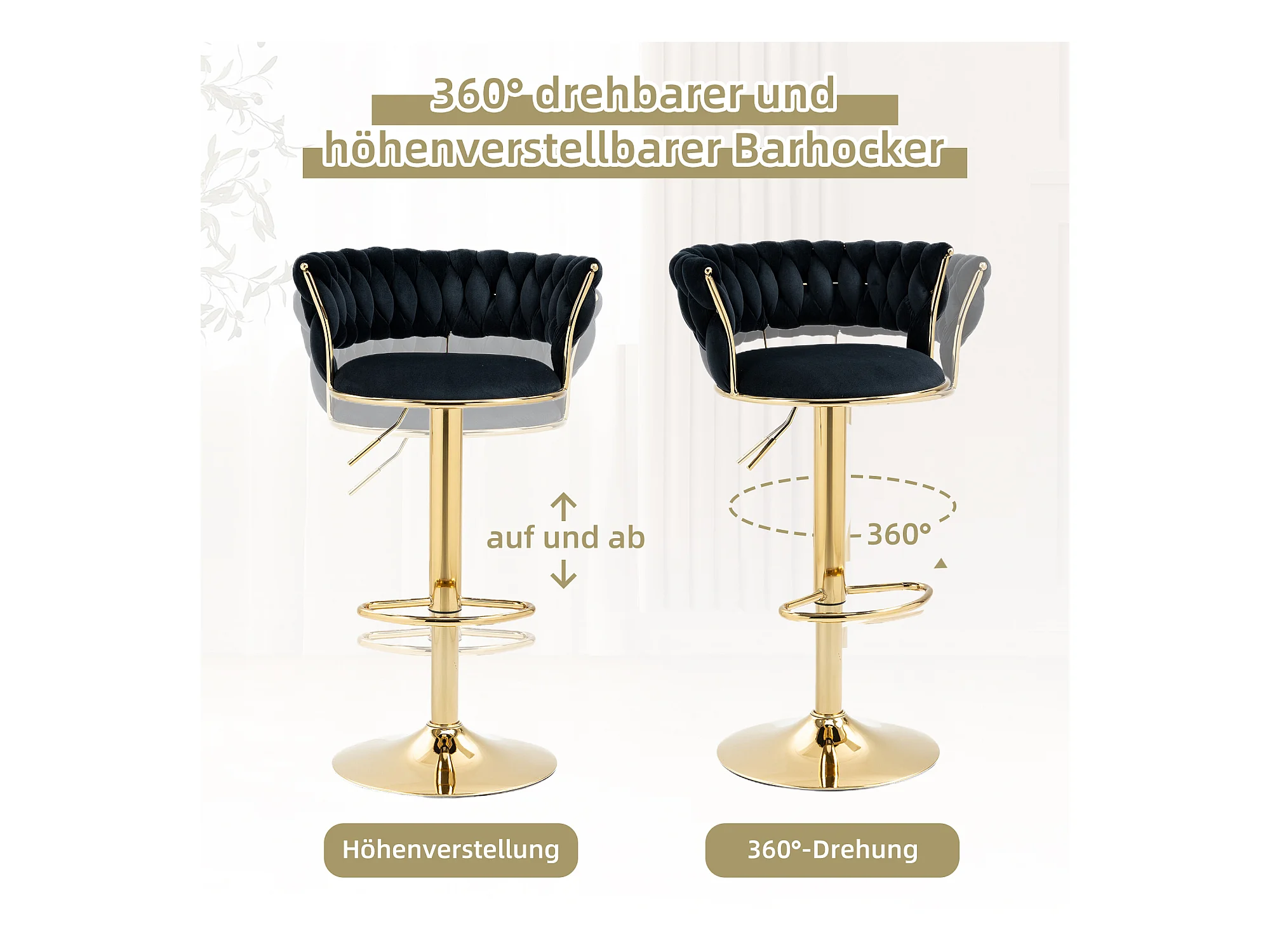 Set de 2 Tabourets de bar pivotantes à 360° et réglables en hauteur avec repose-pieds, velours, noir et argent