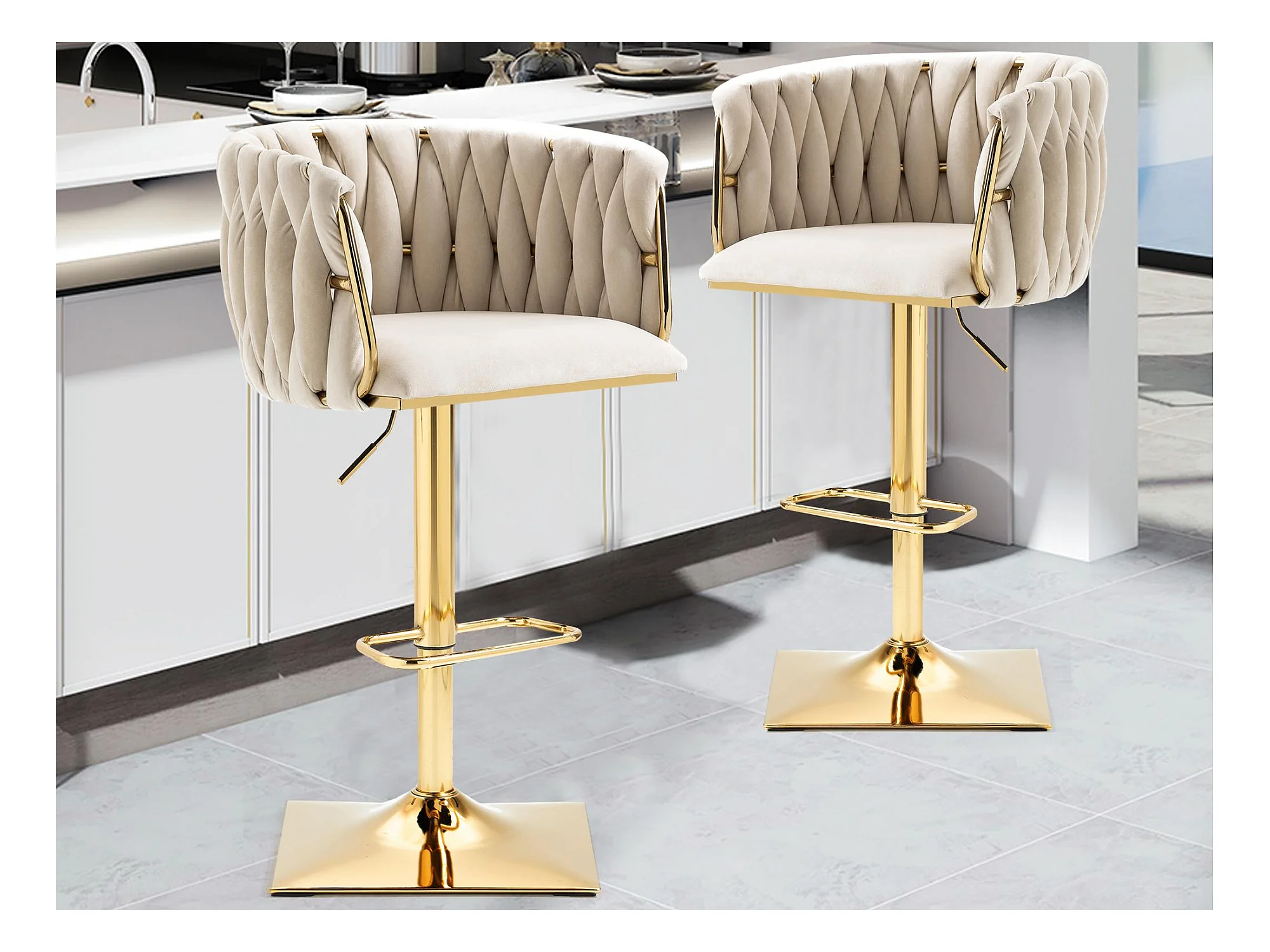 Lot de 2 Tabourets de Bar Tressés en Vert - Pieds en Métal Doré - Repose-Pieds - Hauteur Réglable - Rotation 360° - Idéal pour Cuisine, Salon ou Bar